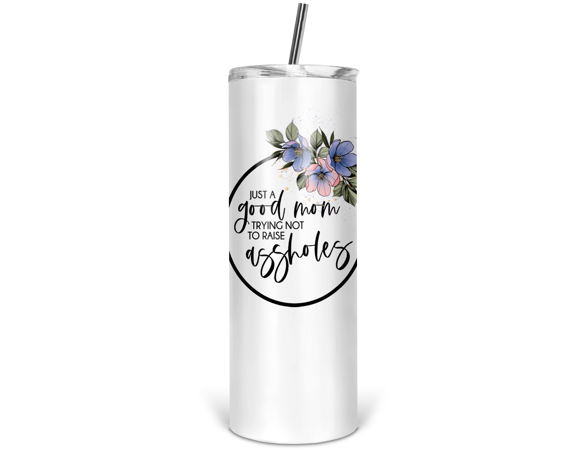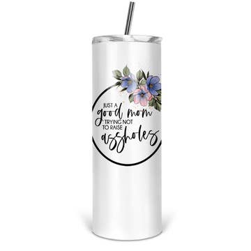 These 20 oz. Skinny Tumblers are made with double wall stainless steel and a white powder coating. Designs are printed on using a sublimation process. They are perfect for hot or cold drinks and fit most cup holders. This listing comes with one tumbler, one clear plastic push on lid, one plastic straw. Colors may vary from monitor to monitor. The image shows all sides of the tumbler for illustration purposes.