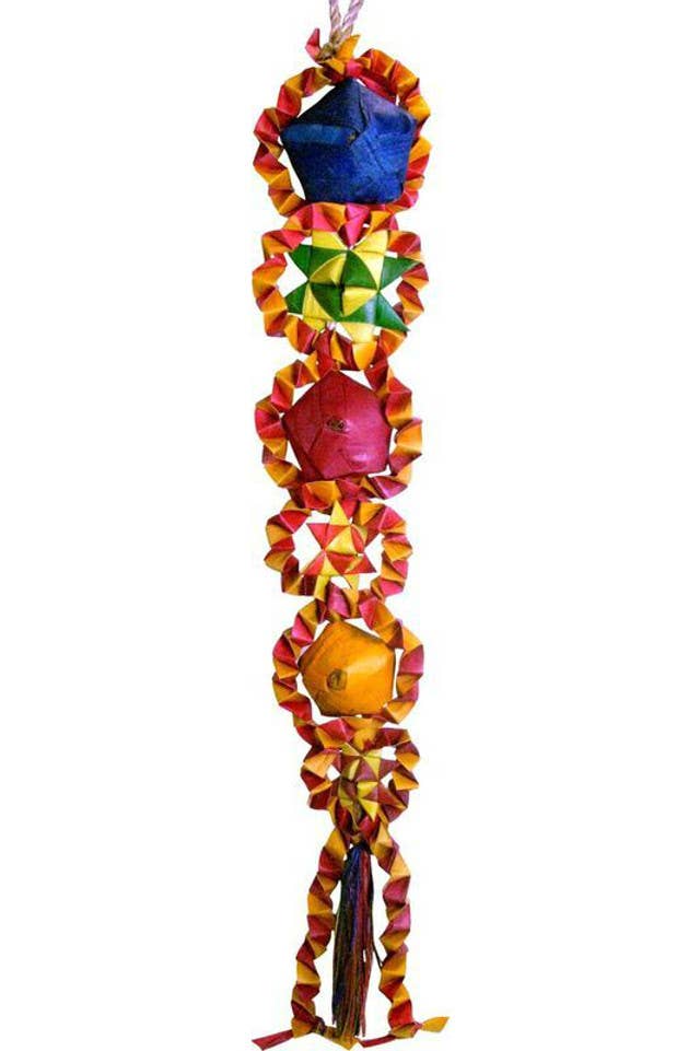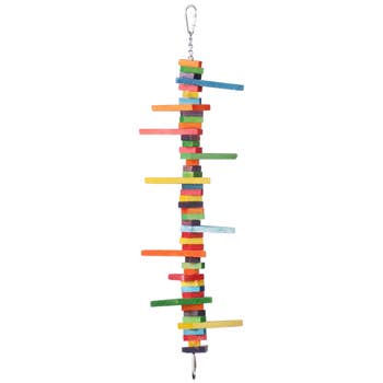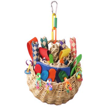 The Large Gumball Machine will make a sweet addition to the birdcage! Made of leather strips and wooden “gumballs”, this colorful toy is the perfect outlet for chewing for medium-sized birds. The beads and wood are dyed using natural food dyes. This toy will help alleviate bird’s boredom and provide mental and physical stimulation to reduce the possibility of feather picking and other behavior problems. The quick link also allows the toy to attach to virtually any birdcage. We also offer the Small Gumball Machine for smaller birds.