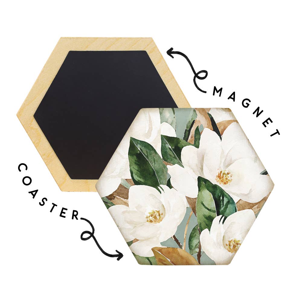 Embrace the season with coasters that bring a warmth and cozy feel to your fall decor. Hand drawn autumn florals will add a subtle and unique pattern to any tablescape. Reuseable and absorbent, these coasters will last you for months, and look stylish while soaking up any drips. Set of four 60 pt chipboard coasters, measuring 3.7 inches. Made in the USA. Our coasters are comprised of wood pulp, made exclusively with shavings from sustainable forestry. They are printed with UV ink, and packaged with a foil-pressed belly band made of recycled cotton paper.
