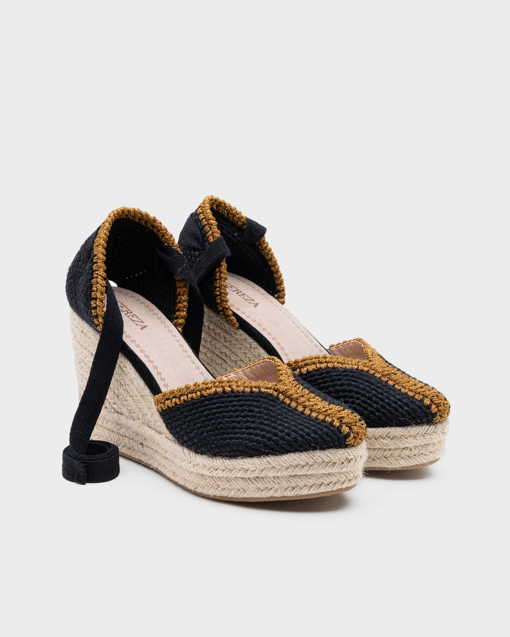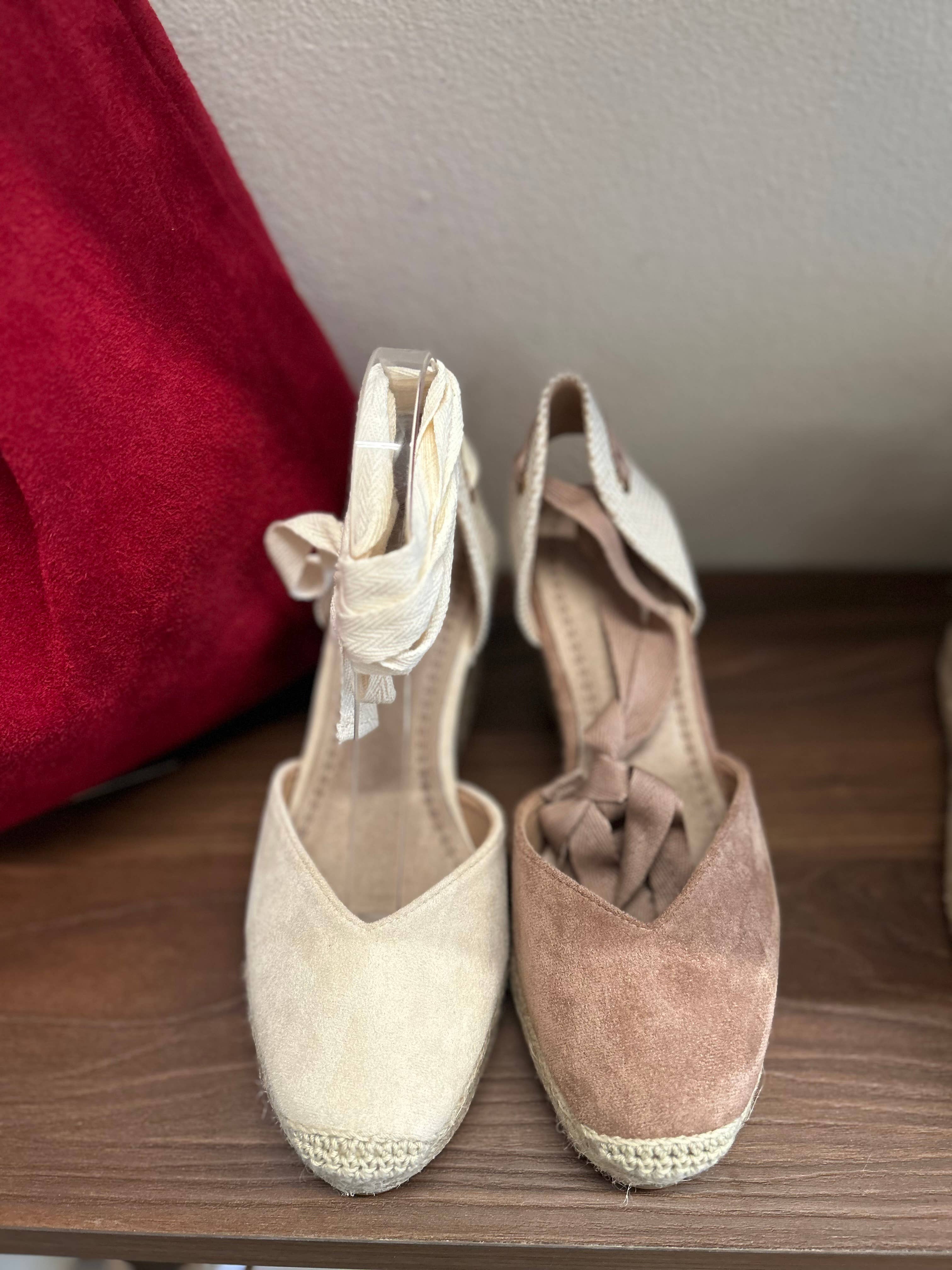 Basic High Wedge Espadrille Sandals. Cotton Herringbone Ribbon Closure, cushioned insole. ORDER BY CASE Case composed of (EU SIZE): 36-37-38-39-40-41; 1-2-3โ3-2-1 SIZE & FIT These espadrille fit just right. Size & fit can vary from shoe to shoe, so please use the standard European shoe size as a general guide. DETAILS Outer Material: Fabric Closure: Cotton Herringbone Ribbon Sole Type: High Wedge Sole Height: 10 cm total (3 cm of platform + 7 cm of wedge) Shoe Width: Normal