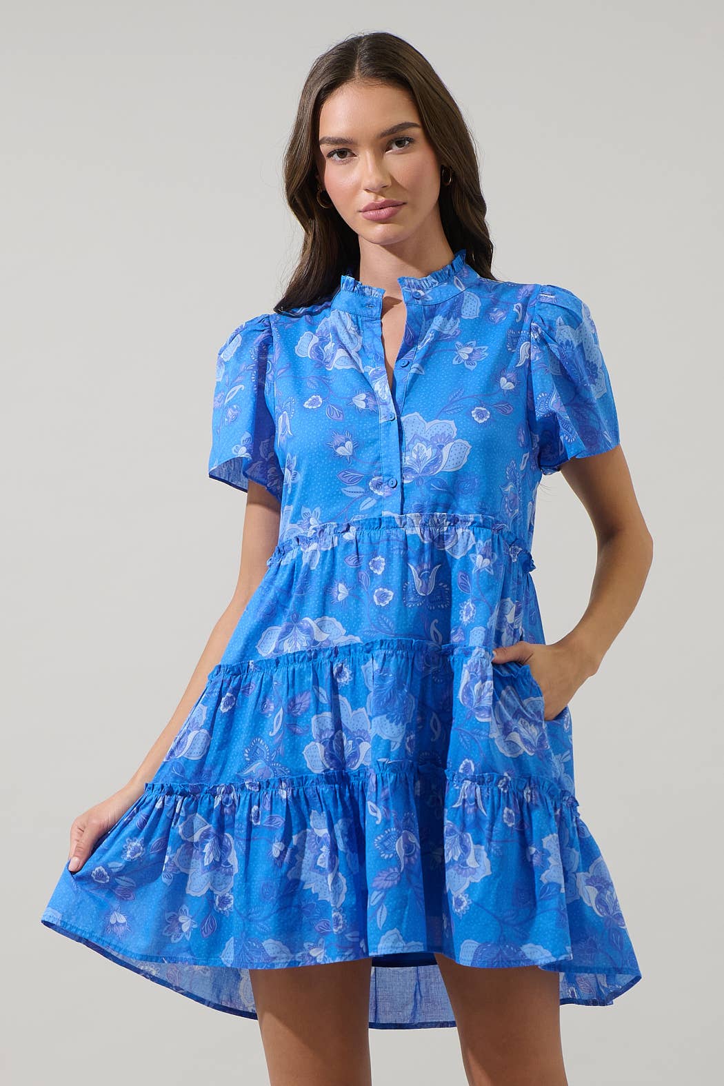 Level up your look instantly with this flirty, feel-good dress! This mini dress features a front button-up, short sleeves, a ruffle split neckline, a flared hem, and side pockets for charm and function. Style it with ballet flats and a woven tote for the perfect daytime vibe. - Mini - Split neck - Pockets - Button up - Comes in 2 colors Size + Fit - Model is 5'9 and wearing size XS - Measurements taken from size S - Chest: 18 3/4" - Length: 35 1/2"
