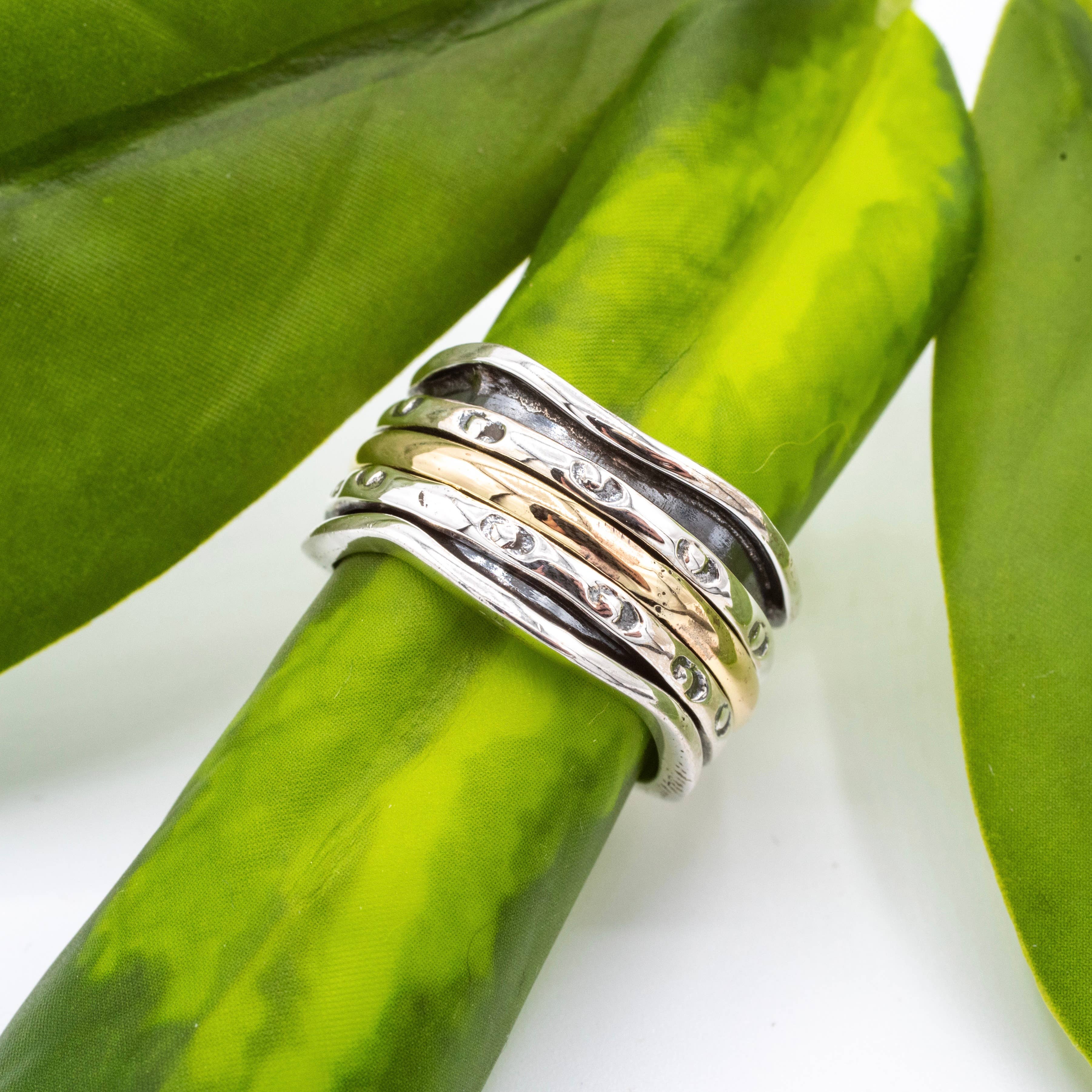 A brushed, matte silver ring coils around and around and then accented with flattened ends. • Measures .5″ at widest; adjusts to fit most. • Crafted from a brass metal mix. It is nickel, lead, and cadmium-free. • Handcrafted by women artisans in India.