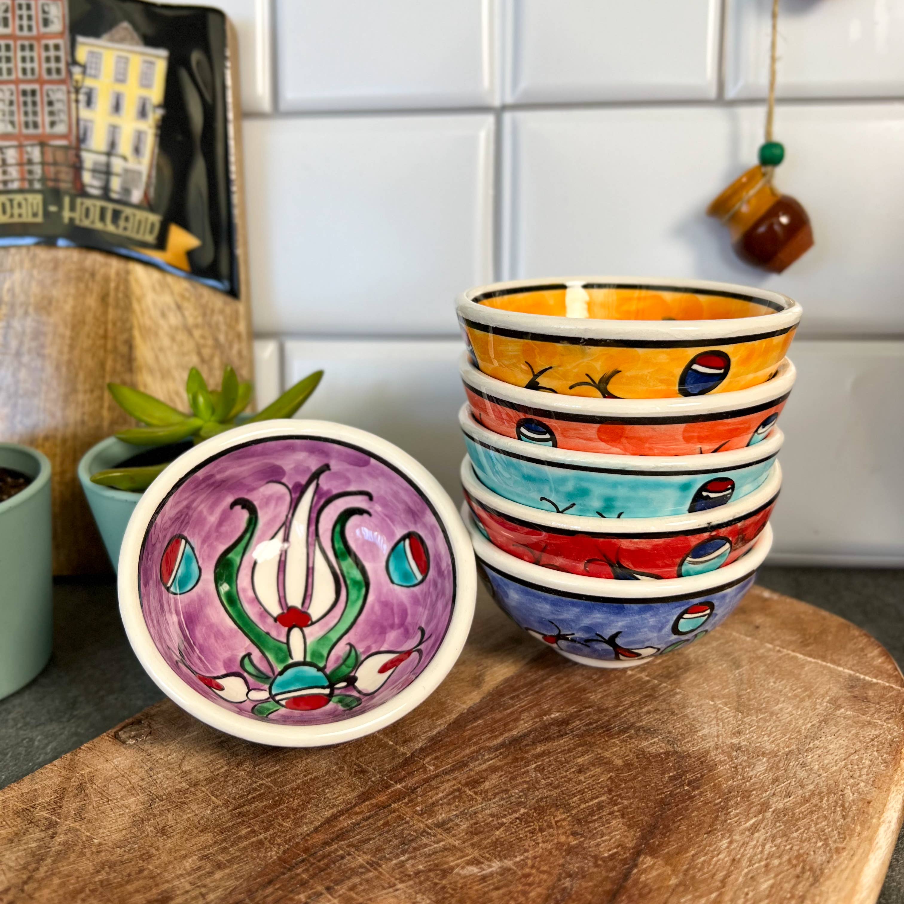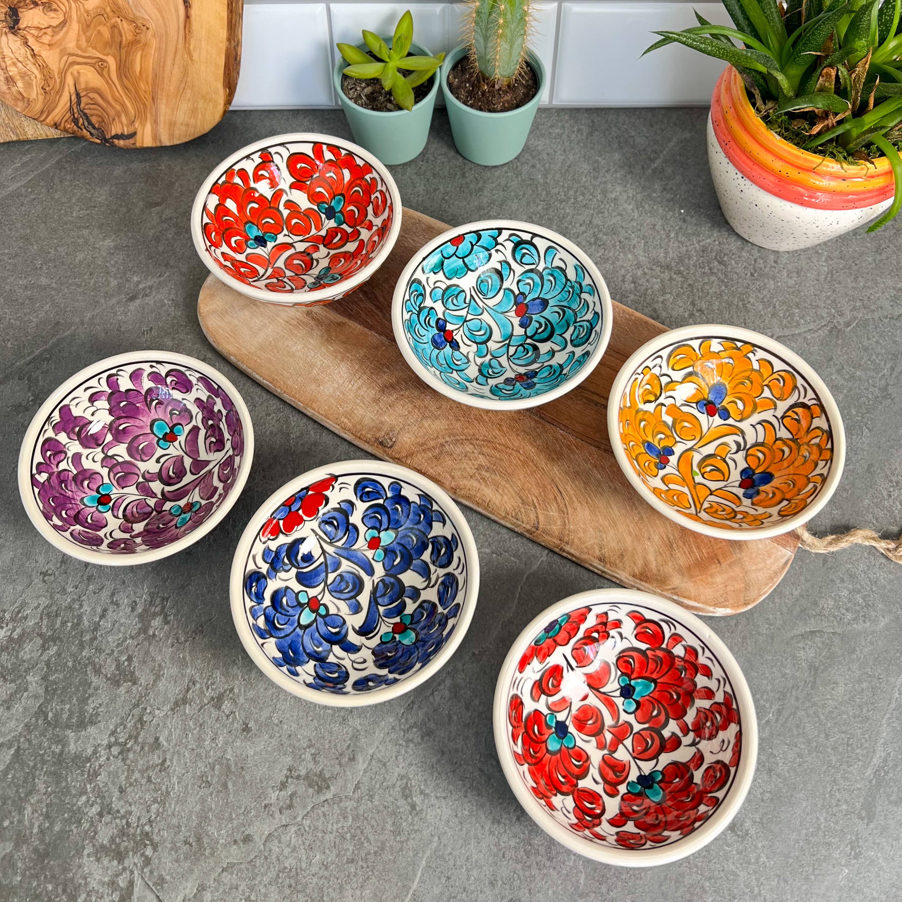 These cute ceramic bowls are handmade in Turkey. These bowls are 3" wide. They can be used for dipping sauces, nuts, cheese boards, olives in the kitchen. Also, they can be used for storing jewelry, display... They are dishwasher safe. Our ceramics are handmade that is why they are all unique and genuine. The design on them can differ as we hate limiting the creativity of the maker. They come as a set of 6 in a sponge box for safe delivery to you and your customers. Although we try to get it stamped with "Handmade" at the bottom, some may be missing this detail. Please message us directly, if you have any chipped or broken ones, and we can gladly replace it for you. It is very important for my small business as reporting damaged without getting in touch affects my shop on Faire.