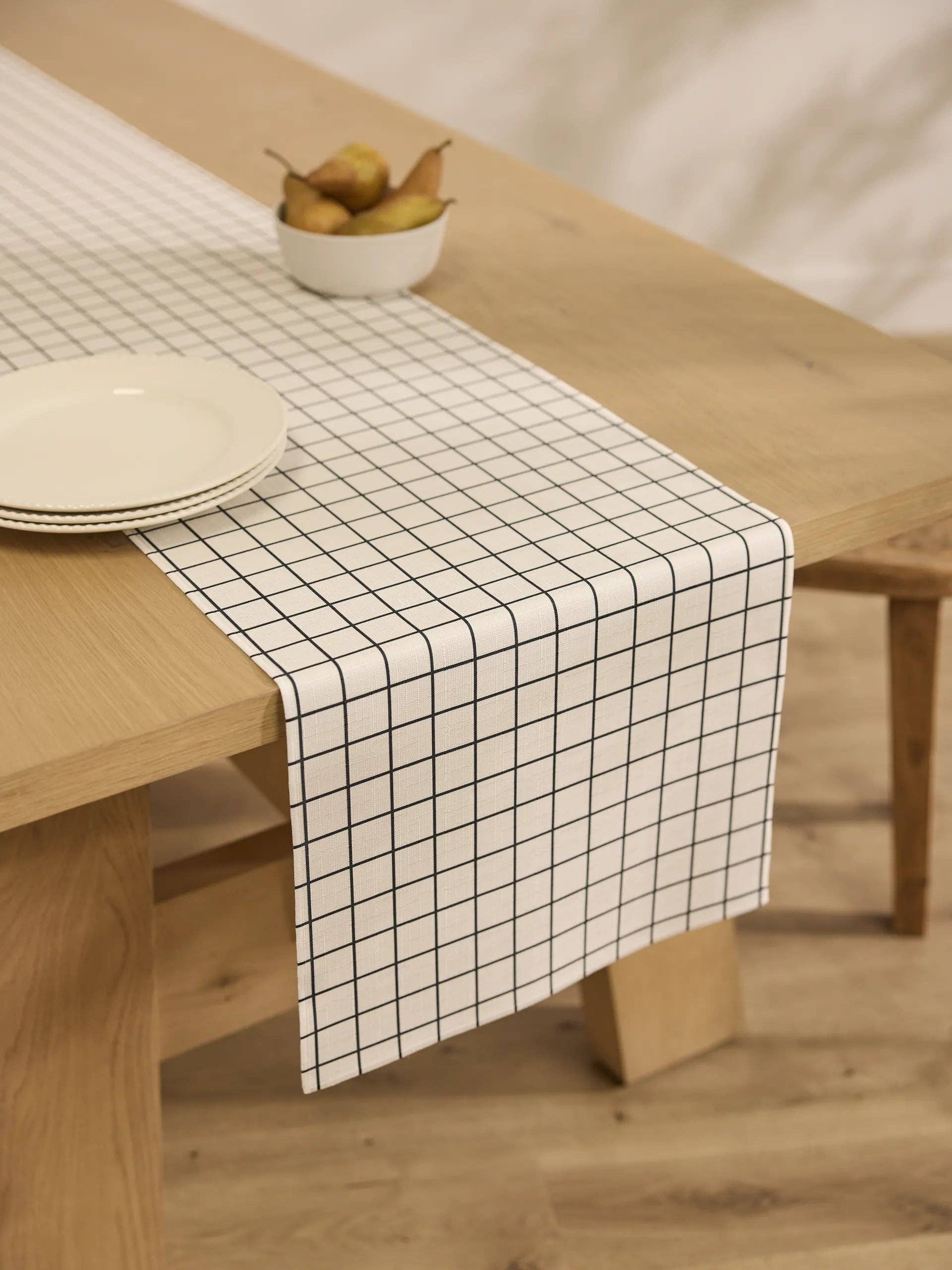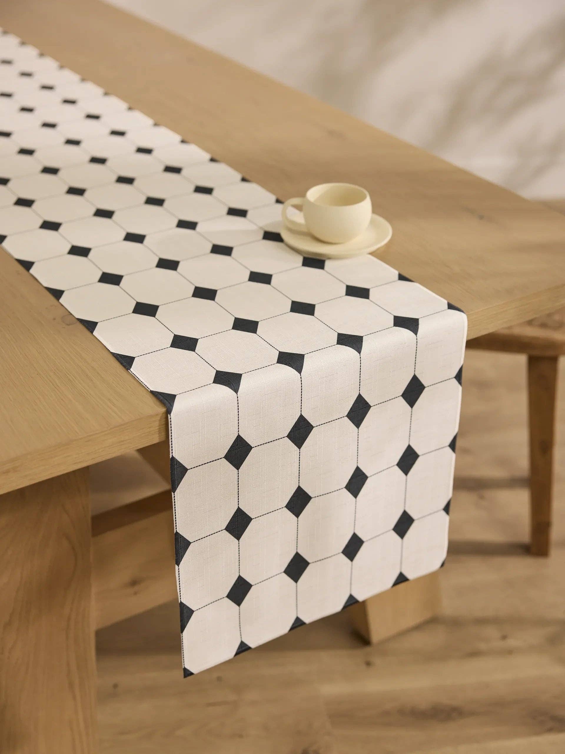 Table Runner The Geometry Table Runner adds a quiet touch of beauty to any gathering—layered, minimal, or styled your way. Available in three versatile lengths, it’s designed to bring a polished look without feeling overdone. Made from 100% post-consumer recycled materials, it resists spills and washes with ease. Everyday-ready. Occasion-worthy. … * ♺ Made from post-consumer recycled materials * Available in 16” x 60”, 16” x 90”, and 16” x 120” * Lightweight with a soft, structured drape * Stain-resistant and machine washable * 100% Satisfaction Guarantee * No questions asked, hassle-free returns … Gather with grace. Tread with care. Whether it’s styled solo or topped with candles and conversation, the Table Runner sets the tone for meaningful connection. Every piece is thoughtfully crafted using materials that would’ve ended up in landfills, giving waste a second life. Minimal impact, maximum beauty. Add elegance to your table. Discover the Geometry Table Runner.