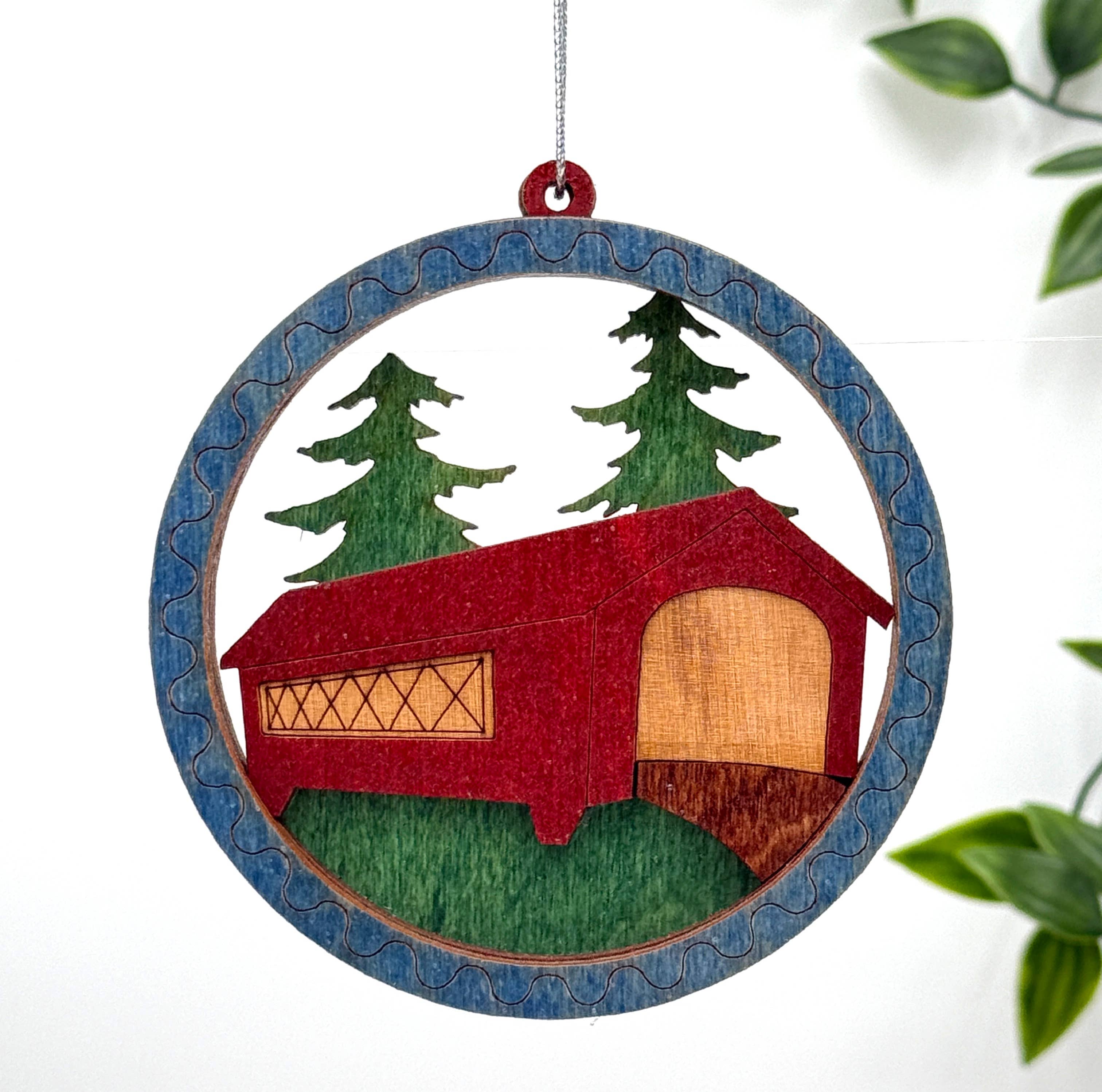 Celebrate timeless New England charm with our Heritage Collection Covered Bridge Ornaments — beautifully crafted keepsakes inspired by classic American architecture and handcrafted tradition. Crafted from premium cherry and walnut wood, this finely detailed 3D Covered Bridge Ornament celebrates the timeless character and craftsmanship of historic New England covered bridges. Its layered construction and rich premium cherry & walnut wood create beautiful depth, warmth, and visual interest—evoking the nostalgia of a simpler time and honoring Maine’s architectural heritage. Each ornament is precision laser-cut and carefully assembled by hand in our Maine workshop, resulting in a high-quality keepsake that appeals to customers seeking meaningful, story-driven décor. Perfect for honoring local heritage, commemorating special destinations, or offering as a memorable Maine-made souvenir, this classic design fits beautifully in holiday displays, year-round décor collections, museum shops, and gift stores focused on regional pride and artisanal goods. Product Details • Handmade in Maine • Premium cherry & walnut wood • Precision laser-cut & hand assembled • Lightweight and easy to hang • Approx. 3.3" x 1.8" x 1.8" • Packaged ready for retail display *Note - Any customization is typically on the bottom of the ornament (see picture), if wanting something else please reach out and we would be happy to accommodate. Be sure to check out our other Covered Bridge Ornament - "Classic" listing on Faire before placing your final order!