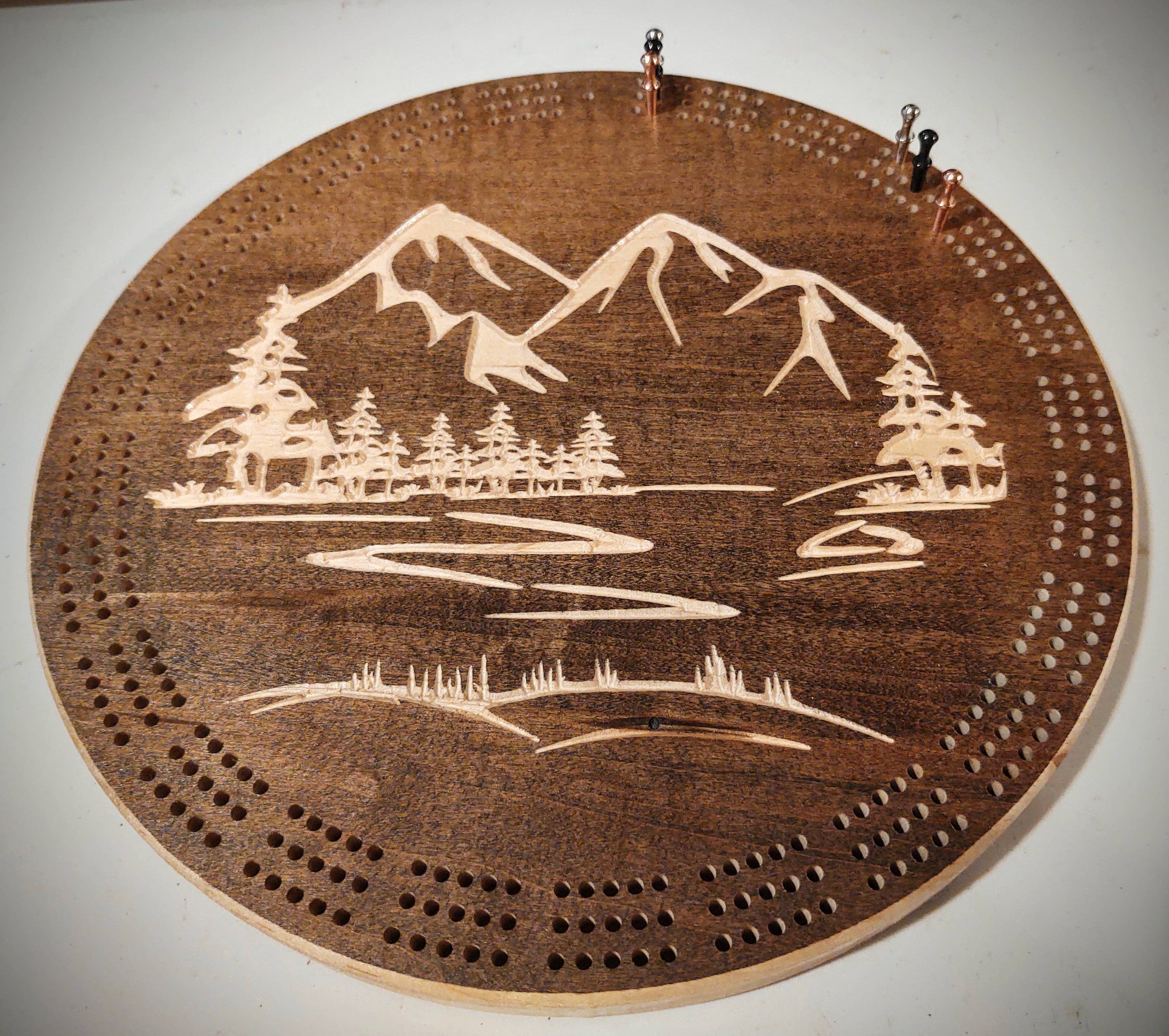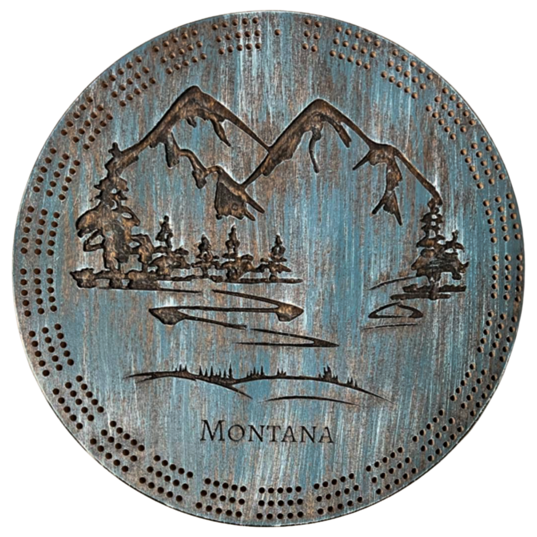Mountain Moose scene Solid hard wood cribbage boards. Typically made with Maple Oval size 7.25"x 12.25" MT Shape size 12"x7.25" Round size 10"(other states may be available, inquire for details) 3 track boards CNC carved custom designs. Natural(light) or dark colored carved can be chosen. Espresso, Ebony and Natural will look more natural and show wood grains. Colored choices will not show much for grains. Custom peg storage on back, 6 pegs included and rubber feet for stability and non-slip Custom designs available, add location, name, specific image, etc... name drop may be added, must request exact spelling/location in notes ie: "West Yellowstone" under Moose **Free local delivery, contact us for coupon code