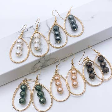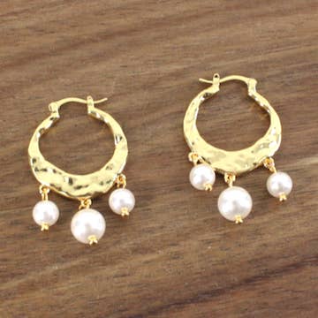 Gold plated earwire. Circle or hexagon gold plated charm with pearl. Colors vary. Length: 1.5"