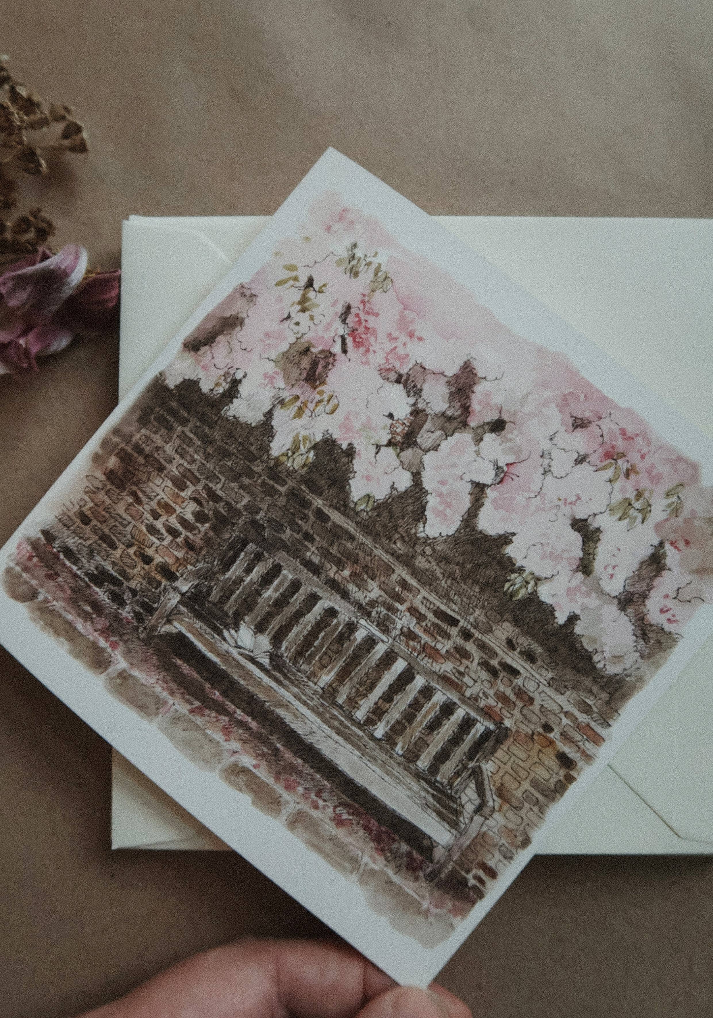 Illustrated Floral Greeting card, folded card with my original watercolours and ink drawing with a blooming garden in front of an old style romantic house. SIZE: 5"x 5" (13*13 cm) PAPER: beige 300 gsm weight design paper INK: offset print The card is blank inside and it has my logo with a little flower on the other side. Brown craft envelope is attached and included in the price.