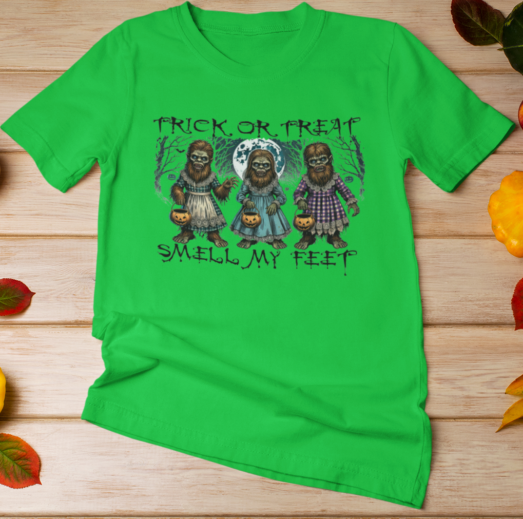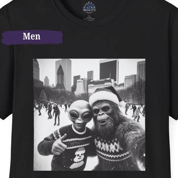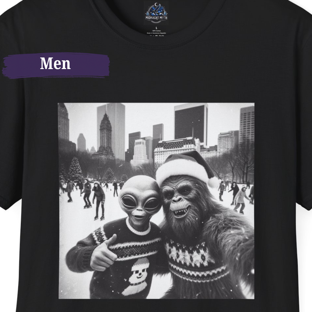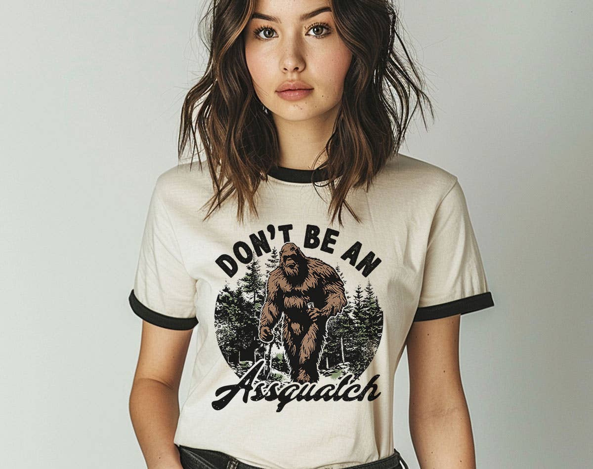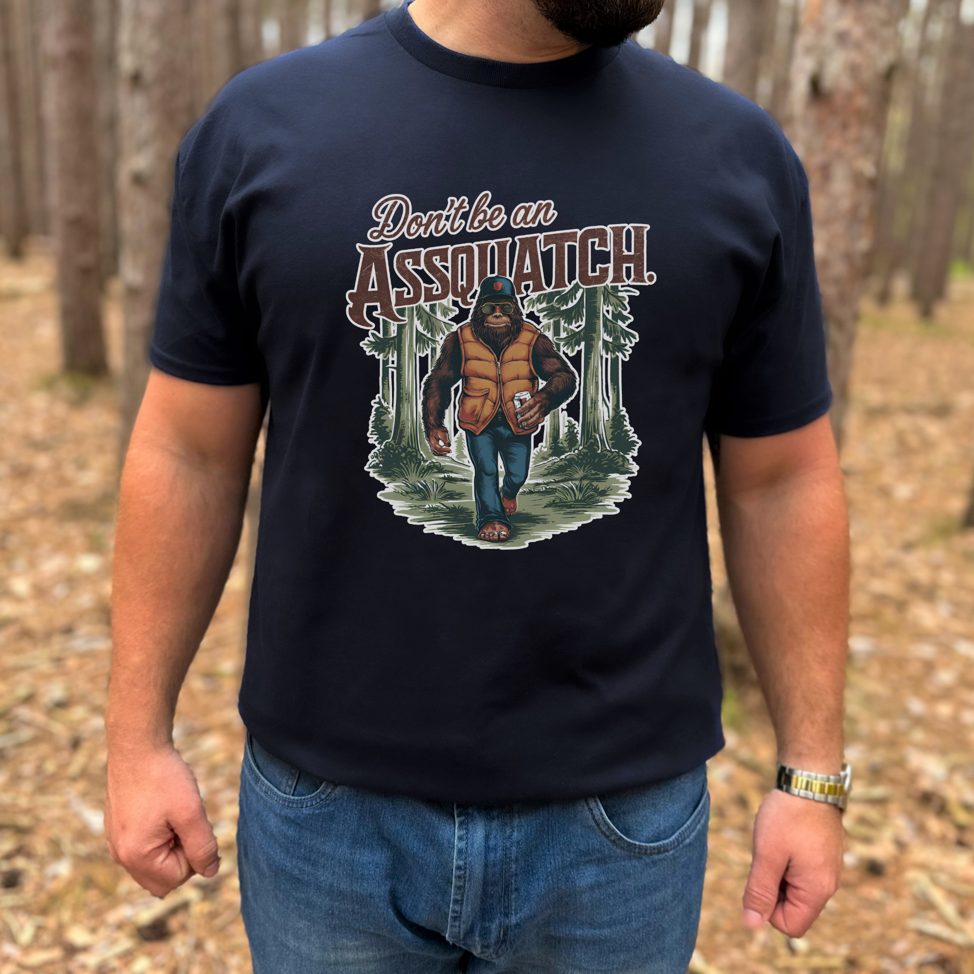 Modern, full color DTF transfer design. Design features a Bigfoot silhouette with a Sasquatch Research Team logo. Dtf print is durable and flexible to hold up better in the wash.