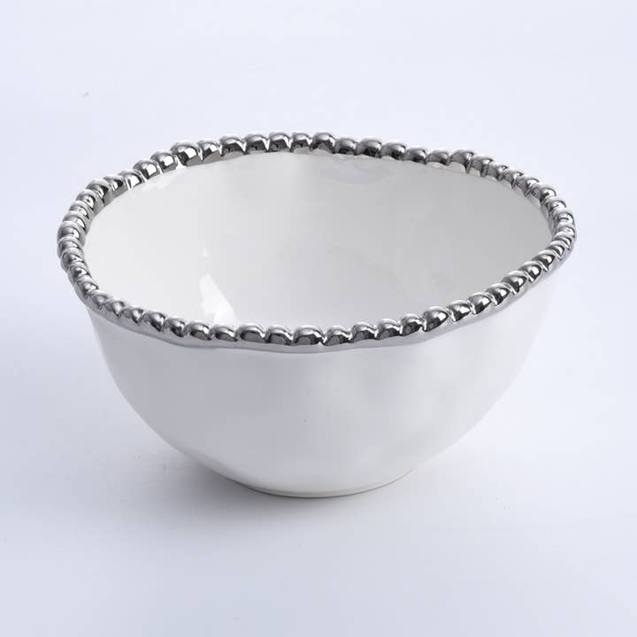 CER2572W 4 Section Bowl from our Salerno Collection. Great for appetizers, tapas and antipasto. Or use for toppings for a make your own sundae, taco or pizza night – the options are endless! High-fired white porcelain with lustrous silver beads in titanium. Food safe, dishwasher safe, oven safe to 550°. Easy Care.