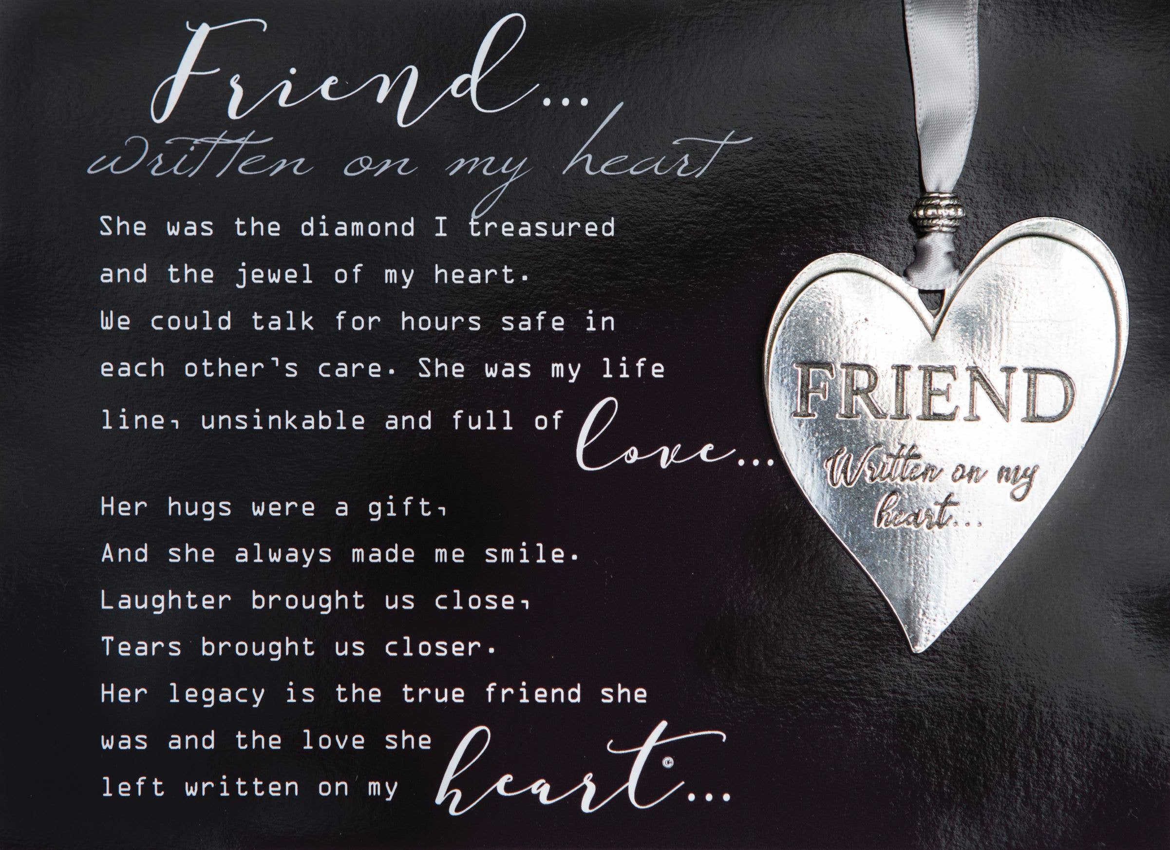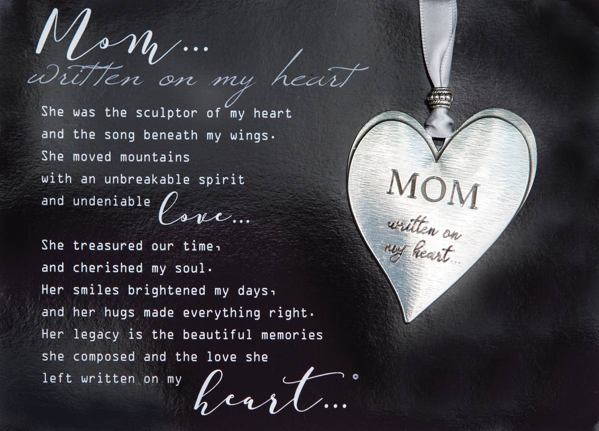 A beautiful gift for someone who has lost a father. The 100% lead-free pewter heart ornament is handmade in the USA. The 3" ornament is finished with a silver accent bead and gray satin ribbon for hanging. The words, "Dad...Written on my heart" are engraved on the front of the heart. There is plenty of room on the back or front for optional additional engraving. The pewter heart is packaged with a comforting sentiment about the loss of a dad, beautifully written by company owner, Teri Harrison. The sentiment is printed on quality paper and is gift boxed with the heart. The dad ornament is an heirloom quality pewter keepsake that will be loved and appreciated by the recipient. The heart can hang on a Christmas tree, rearview mirror, stand, knob, or wherever it will be a reminder of the lost loved one. The poem is also available in a photo frame, see item 6411.