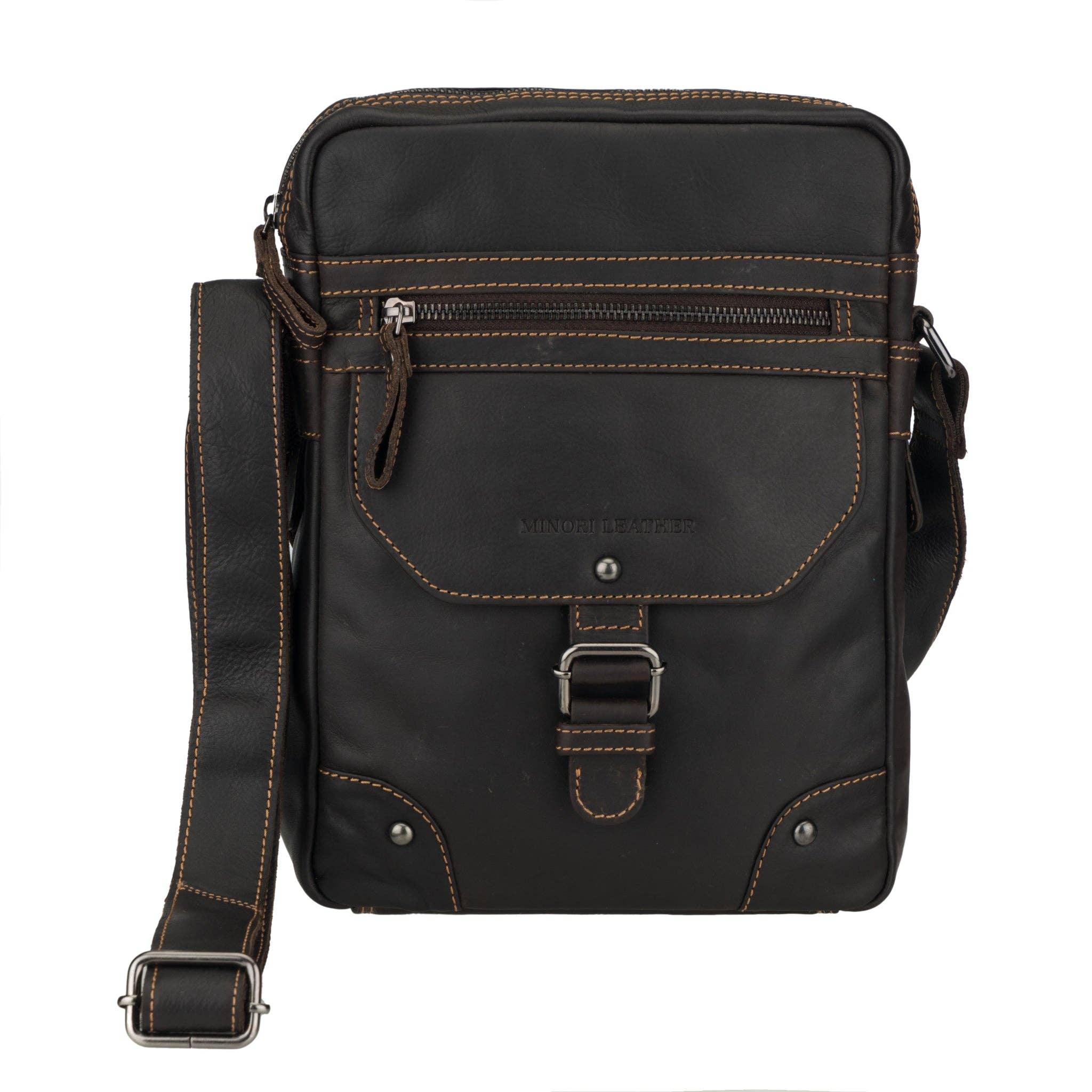 Rugged. Refined. Built for Everyday Carry. Meet the Dallas Leather Shoulder Bag by Minori Leather — a premium unisex leather crossbody crafted from rich chestnut full-grain oil pull-up leather. Soft, durable, and naturally distressed, this leather crossbody bag develops a deep two-tone patina with every use, making it the perfect choice for anyone searching for a vintage-style leather bag, a men’s leather shoulder bag, or a compact everyday leather crossbody. Designed for effortless daily carry, travel, and elevated gifting, the Dallas blends rugged elegance with sleek, compact practicality — making it a timeless companion for both men and women. Product Highlights * Material – Handcrafted from premium Full-grain oil pull-up cowhide leather for exceptional durability and a naturally rich vintage finish. * Color – Brown with contrast stitching for a timeless, professional look. * Dimensions – 7.7 in (W) x 10 in (H) x 2.8 in (D) * Weight – 1.43 lbs — sturdy yet comfortable for daily use. * Strap – Adjustable leather strap with canvas reinforcement, extends up to 65" for versatile shoulder or crossbody carry. * Hardware – Premium YKK zippers ensure smooth, reliable access. * Design – Magnetic flap closure with inner zipper for enhanced security * Capacity – spacious enough for an iPad Mini or similar tablet, with a separate front organizer Smart Organization * Main Zippered Compartment (7.5" × 8.5") – Spacious enough to carry an iPad Mini or similar tablet along with your everyday essentials. * Interior Layout – Includes a secure back zippered pocket (6" × 6.5") and a slip pocket (5" × 6") for quick-access items like your mobile phone, wallet, or sunglasses. * Front Section – Secured with a magnetic flap closure. * Outer Flap: One slanting pocket (6.5" × 4") for slim essentials. * Under Flap: One zippered pocket (5.2" × 6") plus a roomy slip pocket (8" × 8") ideal for tickets, notes, or small accessories. * Back Pocket (6" × 7") – Discreet zippered compartment, perfect for documents, travel items, or cash. Designed For: * Men and women (unisex design) * Daily commuters, travelers, and anyone seeking compact, stylish functionality * A thoughtful gift for anyone who appreciates authentic handmade leather goods