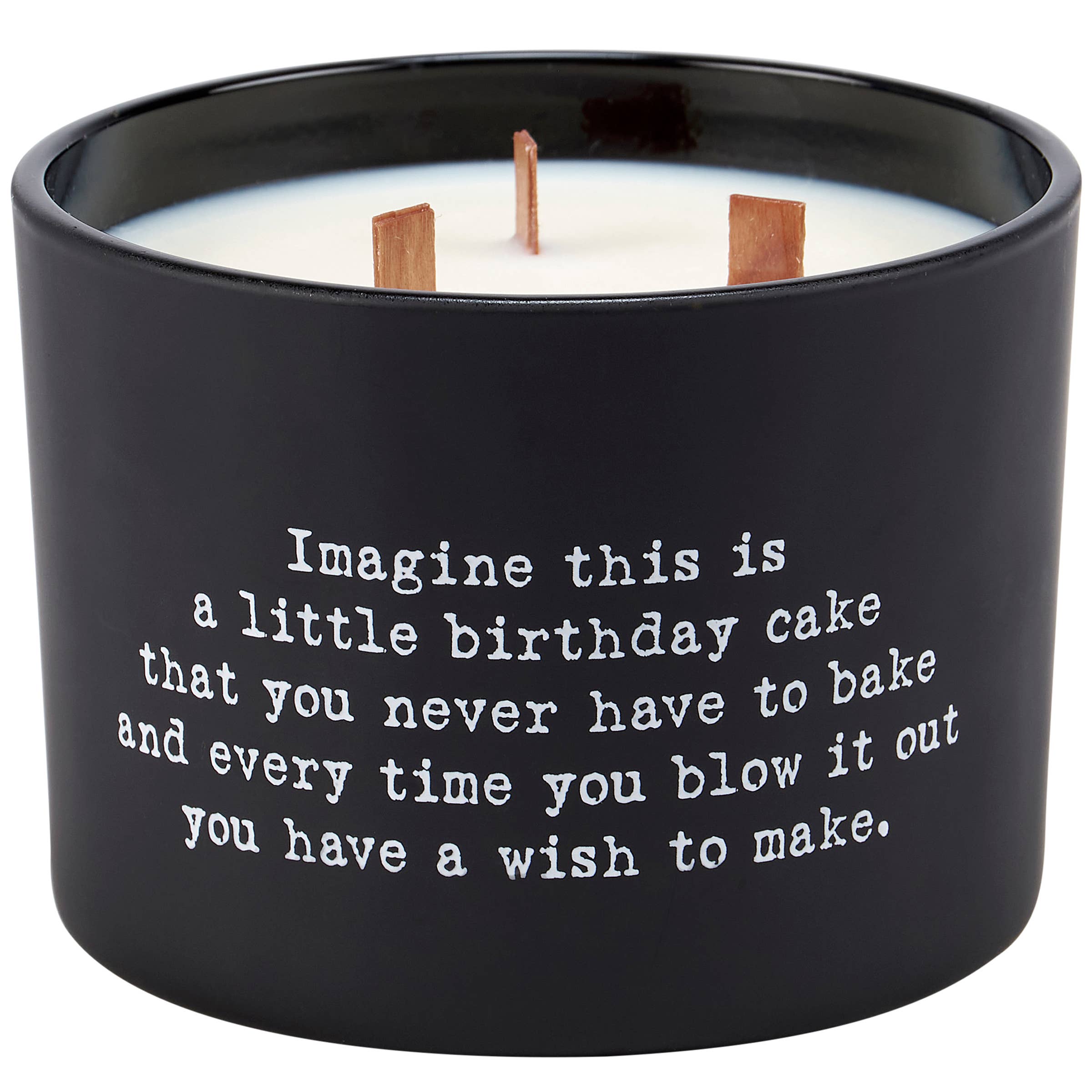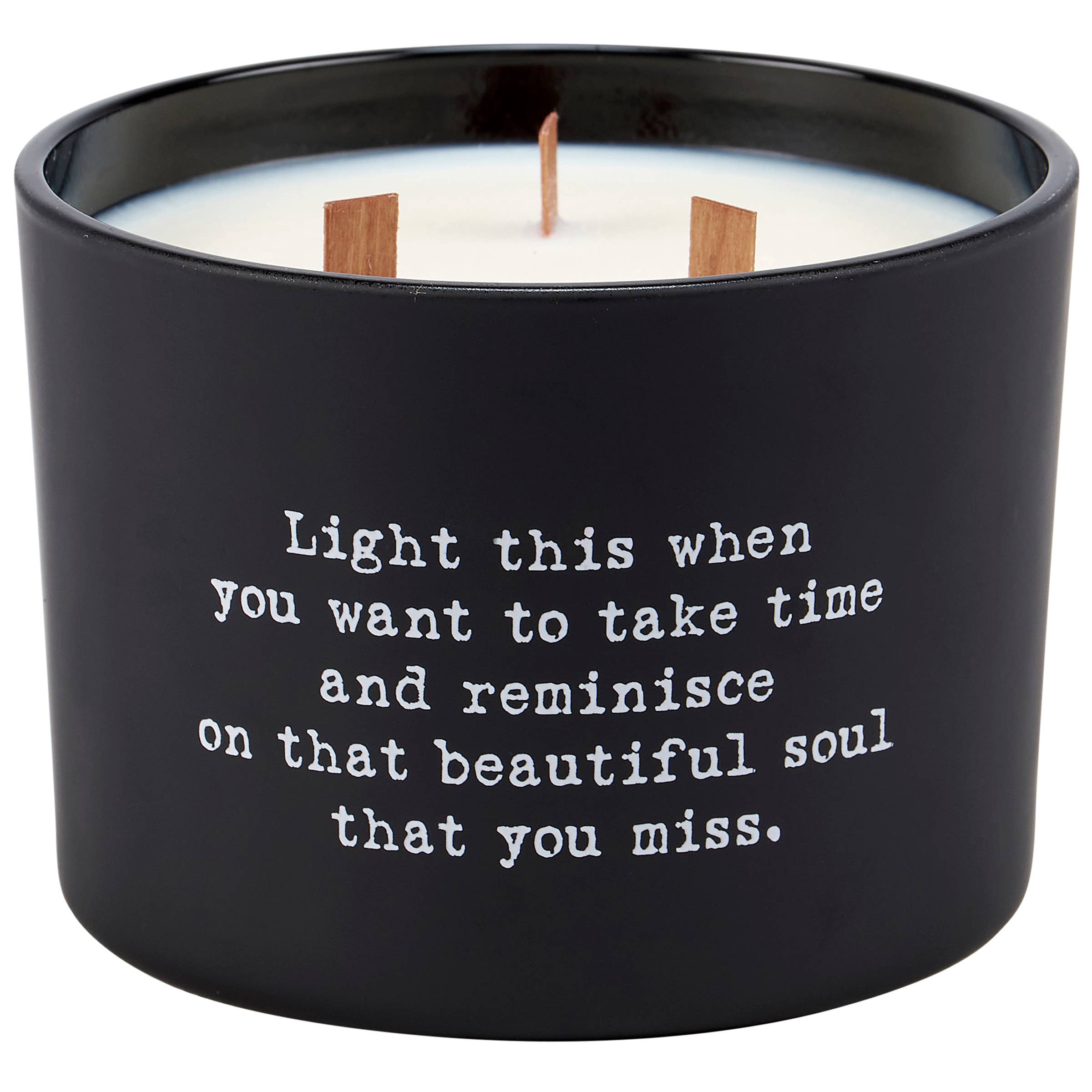 A candle from our Box Sign Style Collection displaying an inspirational poem in a typewriter style on matte black glass that reads "Light this and let the warm glow remind you of every beautiful soul you know." Poetry candle features soy-based wax and 3 wooden wicks with 26 hours of burn time activating a refreshing Pear scent. Our Warm Glow poetry candle includes a dust cover and plastic lid for protection and enhanced appearance on store displays. An inspirational gift perfect for an everyday home accent.