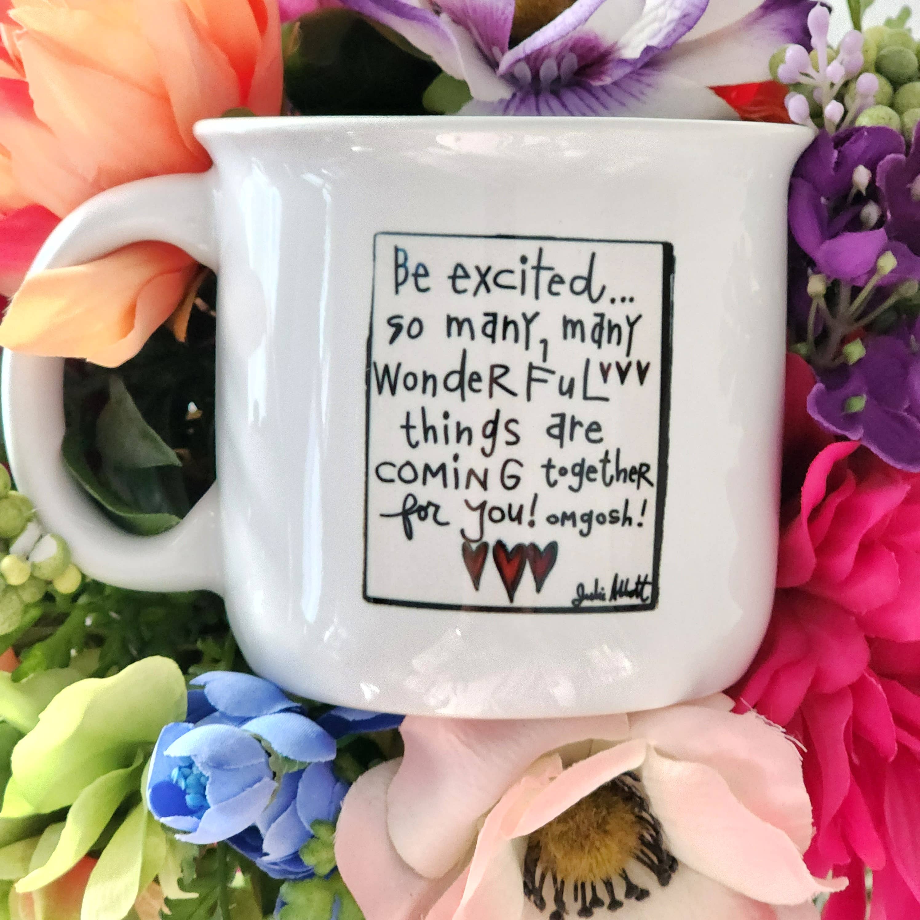 Enjoy your favorite beverages around the campfire or for your morning coffee with this ceramic mug with a delightfully cheerful design from Michigan artist, Julie Abbott. Each mug features artwork on both sides and a large, D-shaped handle for a comfortable grip. Large 15-oz ceramic mug. Mug manufactured in China. Printing, and design in the USA.