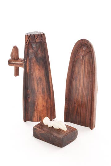 Kenyan artisans utilize abundant banana palm leaf fiber to create unique collectibles. This sweet nativity scene is handcrafted from banana fiber, wire, corn husk and wood. Featuring Mary, Joseph, the infant Christ, a shepherd and animals, the scene fits nicely into its single door stable. Sold as a set. Because this is a handcrafted item, sets may vary slightly. Dimensions: Stable: 4.5"L x 2.25"W x 7"H Figures: 3-4"H Crafted from: Banana fiber, wire, fabric, wood