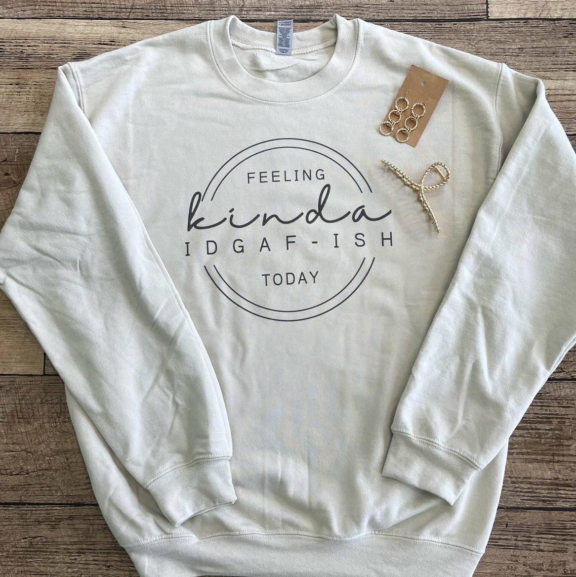 Embrace your mood with the Feeling Kinda IDGAF-ish Today Crewneck Sweatshirt. This cozy sweatshirt combines comfort with a bold attitude, perfect for days when you just want to keep it real and carefree. Wear it to express your laid-back vibe while staying warm and stylish wherever you go. This cute pullover is super soft, comfy, and has a slightly faded, pre-washed look. Order yours now in plenty of time for Mother's Day or just to wear all year round! These garments are made from polyester and cotton. This combination helps designs come out looking fresh and beautiful. The collar is ribbed knit, so it retains its shape even after washing. There are no itchy side seams on these sweaters. • 50% cotton, 50% polyester • Pre-shrunk • Classic fit • 1x1 athletic rib knit collar with spandex • Air-jet spun yarn with a soft feel and reduced pilling • Double-needle stitched collar, shoulders, armholes, cuffs, and hem Please use the measurements in the size chart of the listing to find your correct size, and contact me with any sizing questions. All products are made to order. Colors may vary slightly from one computer/phone to another. Design sizes will vary based on shirt sizes. SIZING A size chart which includes measurements for the sweatshirt in the photo listings. There is also a "How to Measure" diagram to help you measure to find your best fit. I always recommend sizing up if you are worried about the shirt running small. CARE INSTRUCTIONS All items are machine washable using cold water. Please turn inside out and HANG to dry. Do not bleach or dry clean. PROCESSING TIME: -5-7 Days RETURN POLICY: If you want to exchange your item, you are required to ship the item back and pay for the shipping charge for us to send you the replacement. All orders within US will ship via UPS Ground with tracking to arrive within 3-5 business days after shipping depending on your location. Thank you for shopping at Trendznmore! We look forward to doing business with you. Please message us if you have any questions. Your shipment will be arriving from TX with tracking number provided. Thank you and have a great day!!