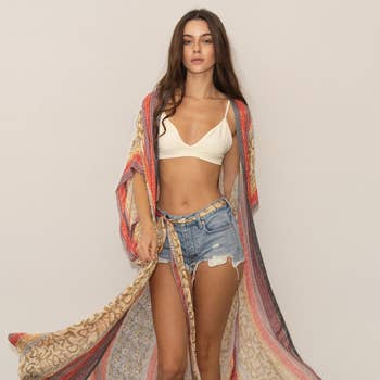 "Our handmade Granny Square Crochet Kimono is a statement crochet cardigan designed for the modern woman. Featuring an elegant, open-front silhouette, this long kimono showcases crocheted multi-floral motif squares arranged in a classic patchwork pattern with crochet flowers throughout. The intricate crochet work and bold color play give it a distinctive kimonos for women boho vibe. Wear it as an easy layering piece to stay warm during cooler months, or style it as the perfect beach sweater accessory on cool nights—this large crochet piece adds texture and personality to any outfit. Material: 100% Acrylic Size: 41"" long, 9.8"" armhole Imported"
