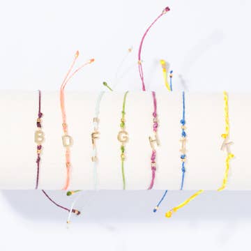 Materials - gold plated letter charms, micro macrame cord + gold plated beads. The bracelets have a sliding back closure also made of the waxed polyester cord. They cinch down to fit both adults and children.