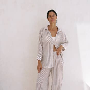 Material * Spandex/Polyester Blend Weight * 600g Package * 1 x Two-Piece Set Feature * White, Black * Button Front Shirt * Wide Leg Pant * Heavyweight Build Note * Machine wash cold inside out * Tumble dry low reshape * Avoid overstretching * Iron medium heat reverse