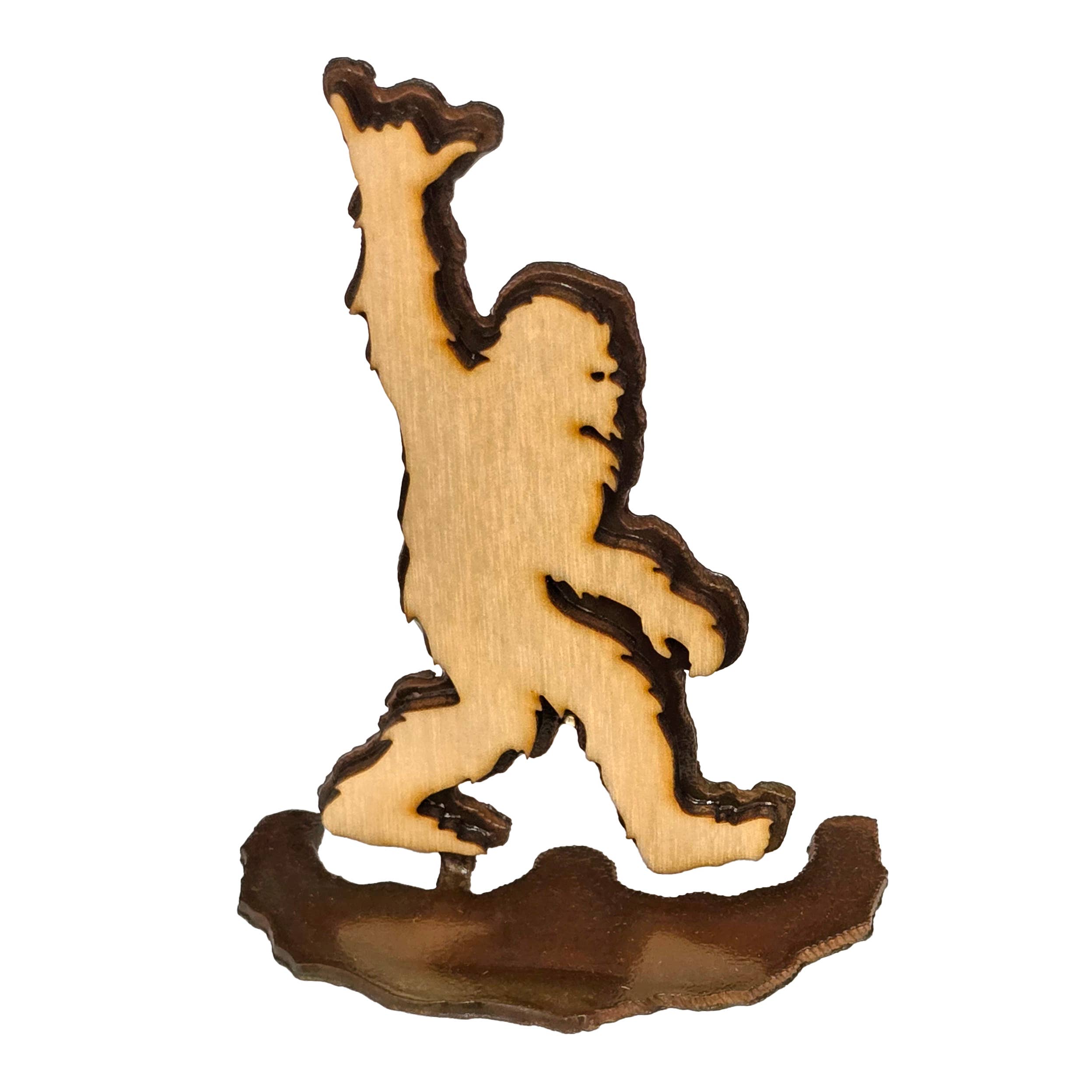 Layered wood design in the shape of Bigfoot with a mountain and forest scene.