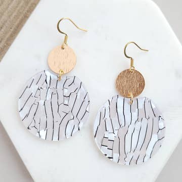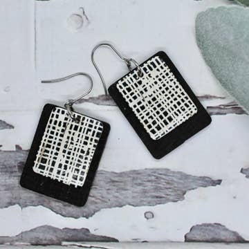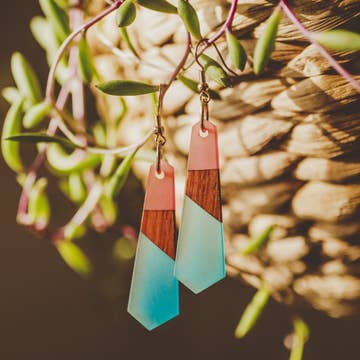 Inspired by the mid-century modern dinettes, these simple, yet elegant earrings are a breeze to wear. These light and neutral-colored earrings are a must-have accessory. The backs are pink to give an extra splash of color. These lightweight earrings are 2 inches tall x .75 inch wide They are created with hand-cut laminate and walnut on hand-crafted sterling ear wires. They are sealed with linseed oil to bring out the beauty of the wood. Do not get wet.