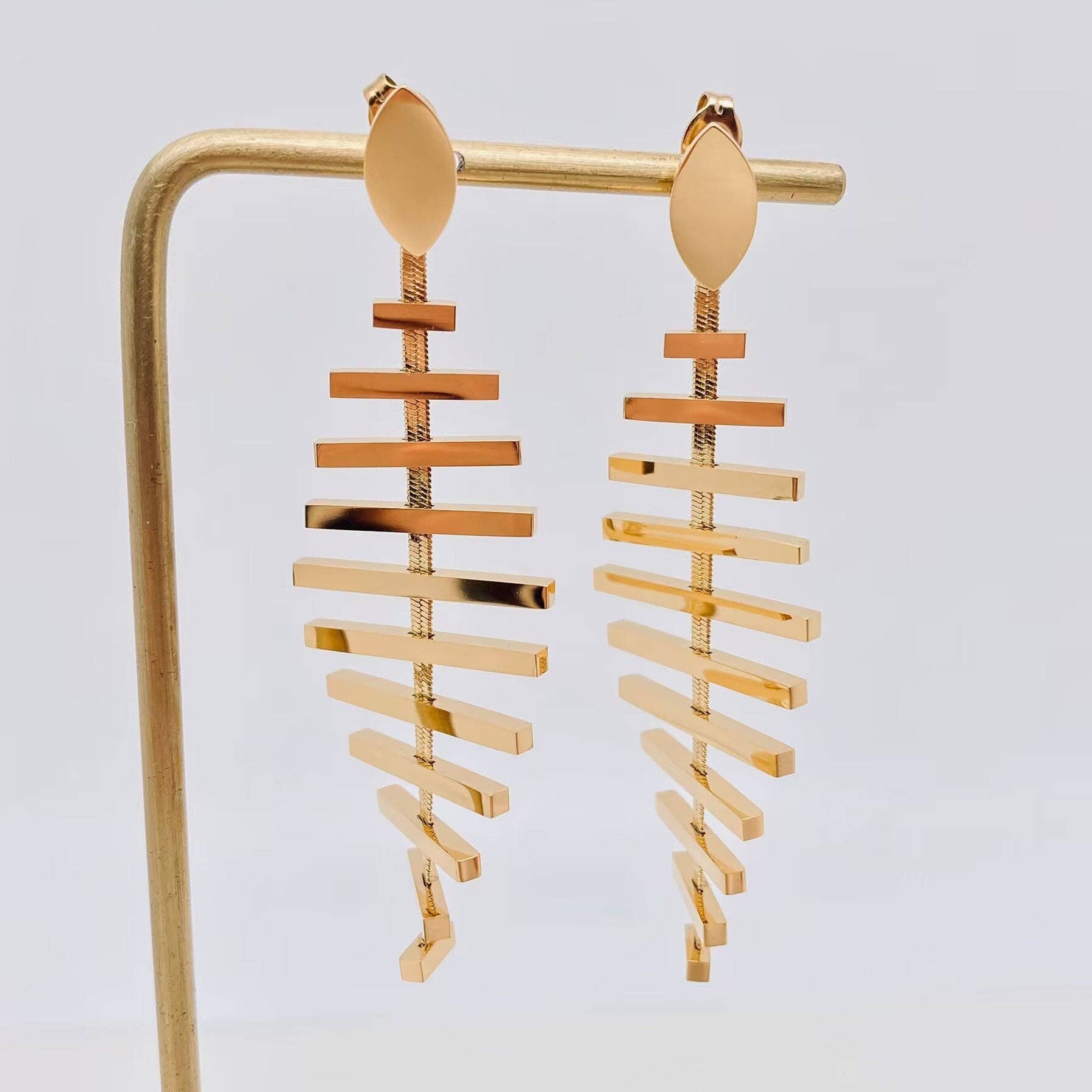 These art deco dangles are clean and classy with a graceful swing to them, making them a perfect accessory for your dinner party or a dressy night out with the girls! Using just a few spools of wire, some brass pieces, and a collection of specialized tools, we hammer, drill, melt, sand, and polish each individual piece until it becomes a wearable work of art. The high quality 14k gold fill ear wires are handmade and attach to a solid brass hand textured semi-circle. Below the circle, varying lengths of brass bars dangle, adding movement and intrigue to this stunning piece. ● Ear wire: 14k Gold Fill ● Hoop and bar metal: Solid Brass ● Solid 935 Silver rod holds the brass bars in place ● Made and designed by Lisa and I in Colorado