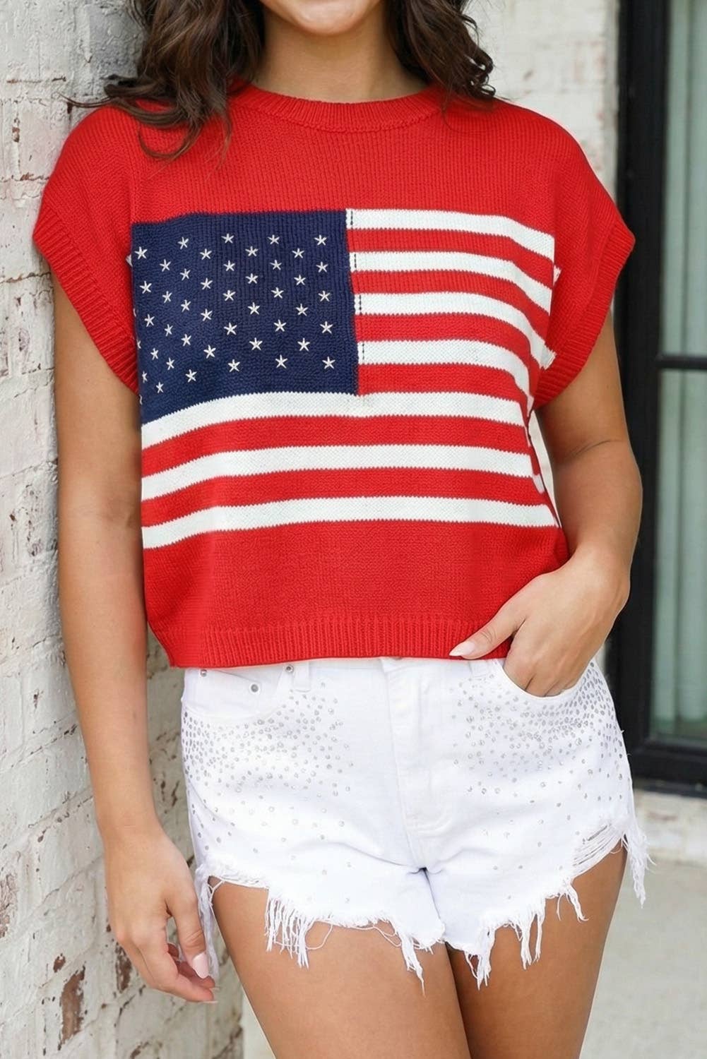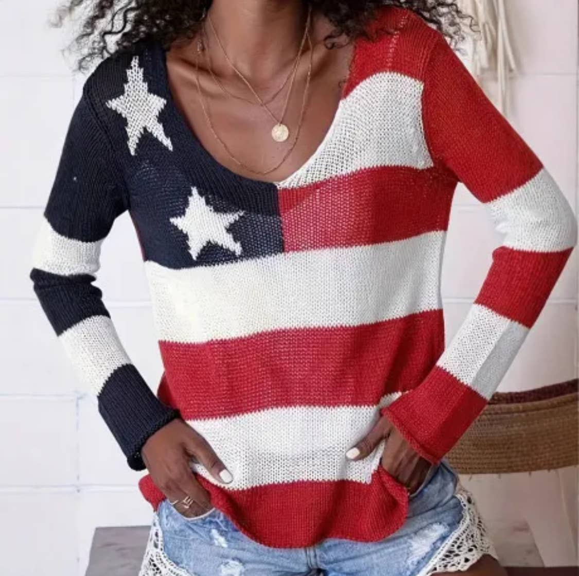 Perfect summer sweater! Thin material in a vintage-style American flag sweater. Features a color contrast design. Available in several shades with a round neckline. Case includes one size small, medium, large and x-large Imported