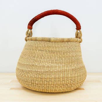 This basket is one of our more popular styles. It's single handle and wide mouth make it a great market basket, magazine storage or fruit basket. The black and white goat leather handle is the signature of the collective we buy from. The elephant grass is dyed in rustic pots over a wood burning fire and the handles are sewn by the men who are employed by the collective. Large Round Bolga Baskets are approximately 15 inches x 11 inches not including the handle and fold for easy shipping. "Natural Palette" refers to baskets with more earth tones, Natural, Natural & Black, Natural & Navy "Traditional Palette" refers to the more common Colour palette of Bolga baskets, those colours chosen by our weavers. Generally These colours are bright, bold and beautiful. Our photos indicate possible selection and the wide variety of possibilities we have had available. They are not necessarily and accurate depiction of our current inventory.