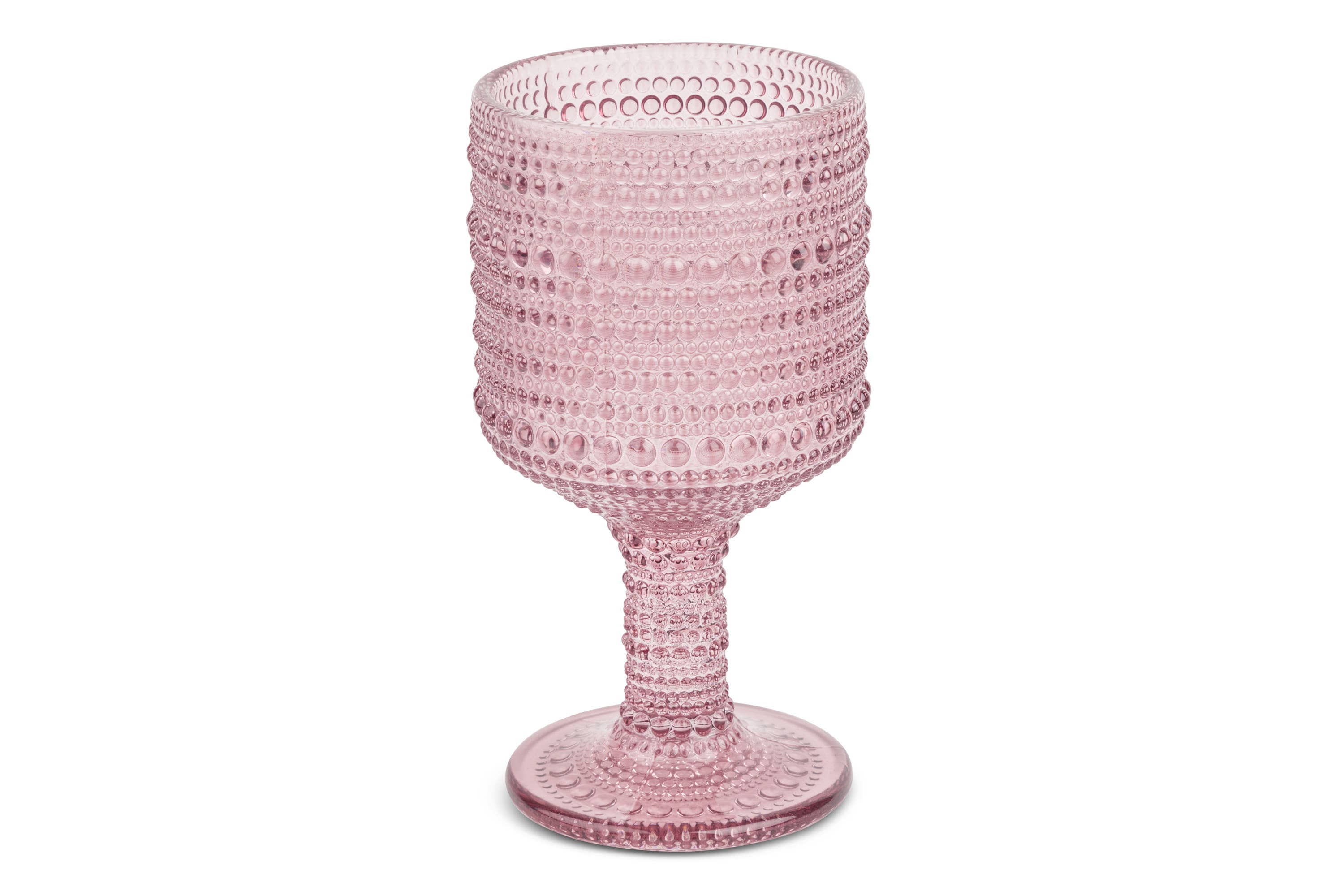 These goblets, presented in muted colors, exude a soft, sophisticated charm that complements the rich hues of your favorite wines. Each glass holds an ample 14.8 ounces, making them versatile for a generous pour of wine or any drink of choice. Crafted with meticulous attention to detail, the beaded hobnail pattern on these glasses is not just a feature but a statement. This textured design not only adds a tactile dimension to the goblets but also plays with light, creating captivating reflections that dance across the surface of your wine.