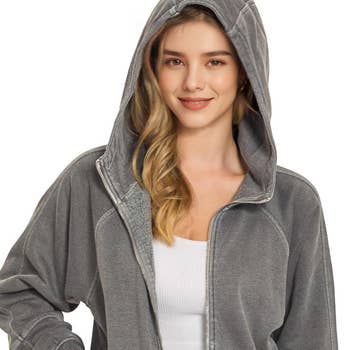 Acid Washed French Terry Zip-up Hoodie W Pockets