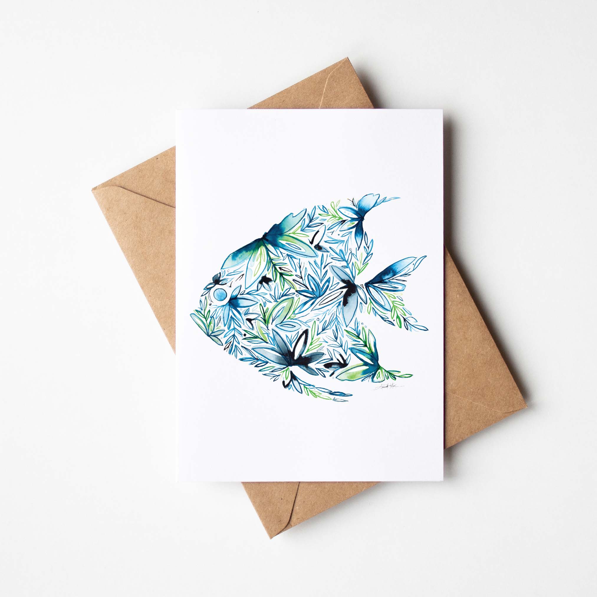 This notecard features a bright and beautiful Amanda Klein signature watercolor design. These are an easy basket builder for any shop and are a perfect grab-and-go item to keep at the register! DETAILS: - Includes: 1 blank notecard + 1 kraft envelope, packaged in a clear cellophane sleeve - Small batch printed on heavy cotton paper, 5 ½” x 4 ¼” - Kraft envelopes are recycled, handcrafted, A2 size (5 ¾” x 4 ⅜”) - 100% made in the USA - Woman owned + operated