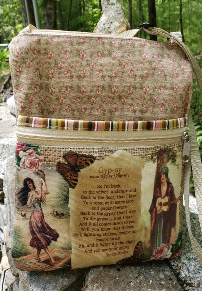 I designed this travel purse using images from the book by L. Frank Baum and some of his quotes. This is the Travel purse which is approx. 8x8. It has a poly. pro strap that is 60" with a triglide making it adjustable to a shorter length. It has a zip closure and 2 side zip pockets. It is cotton lined.