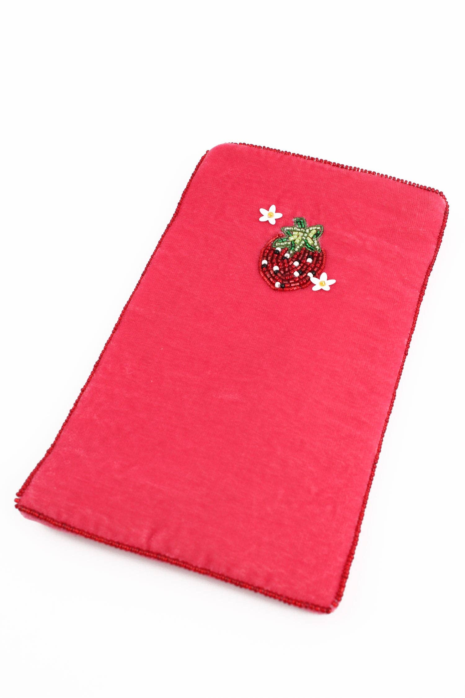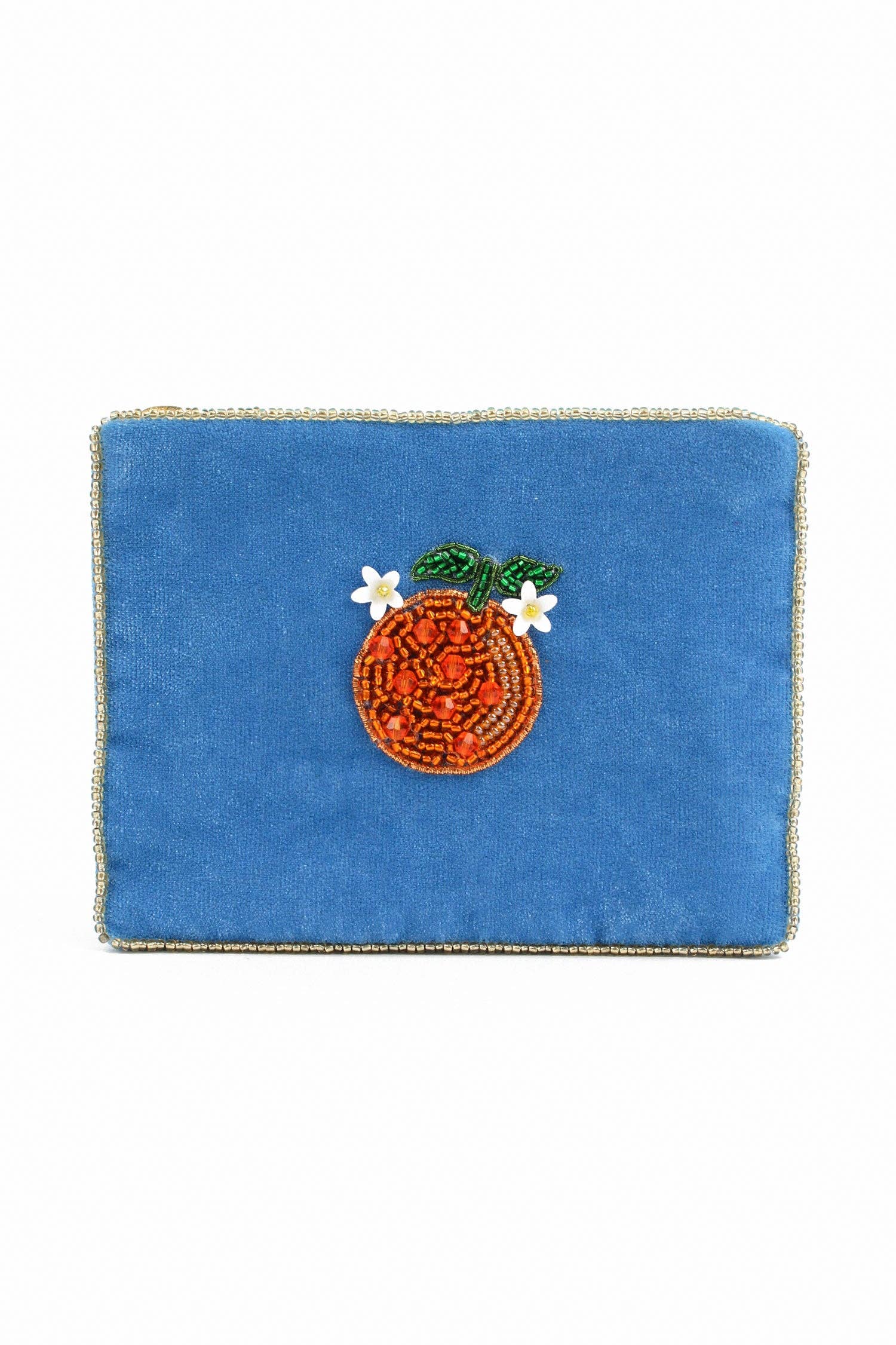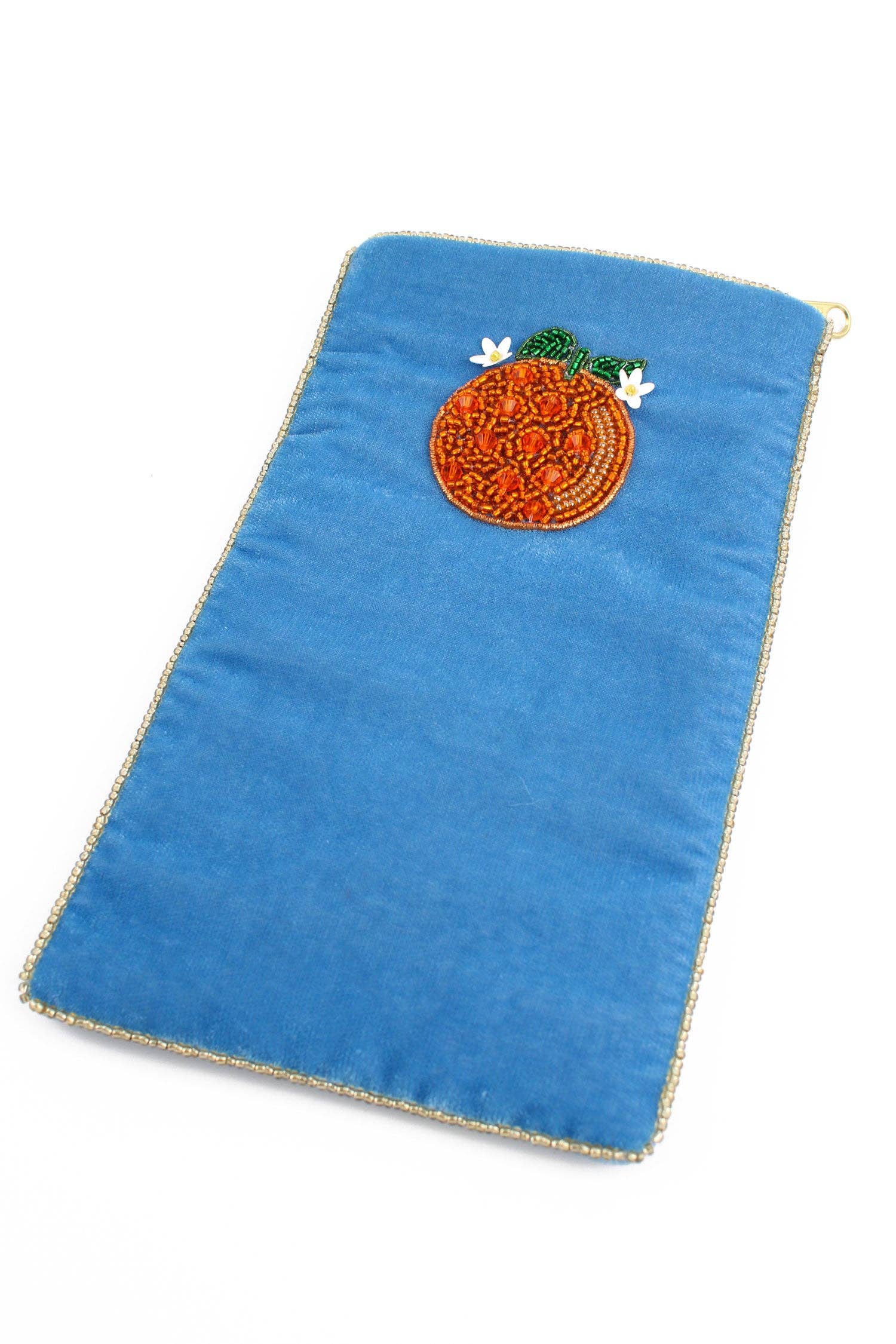 This beautiful green velvet case features an intricate lemon and flower design - perfect for your summer shop displays. -Designed to hold glasses/sunglasses. -Made from 100% polyester velvet with a polyester lining by talented artisans by hand in India. -Approximately 195mm long and 110mm wide with a tonal coloured zip closing. -Featuring glass bead embellishments and finished with a gold bead border.