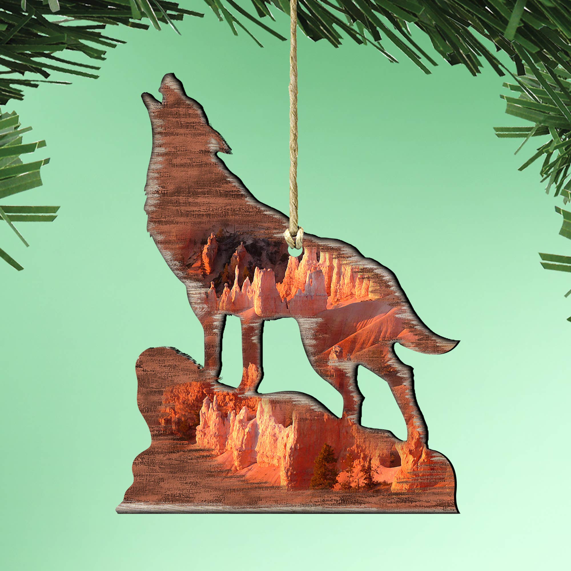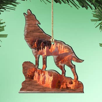 Wolf ornament. 4.5 W x 3 H This Ornament is made with 18 Gauge Steel. Do to the Natural Rusting Process color may vary slightly, Made In Prescott Arizona