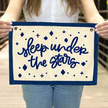 18”x25” canvas banner with screen-printed design with two metal grommets for hanging + screen-printed by hand in Bend, OR with water based ink