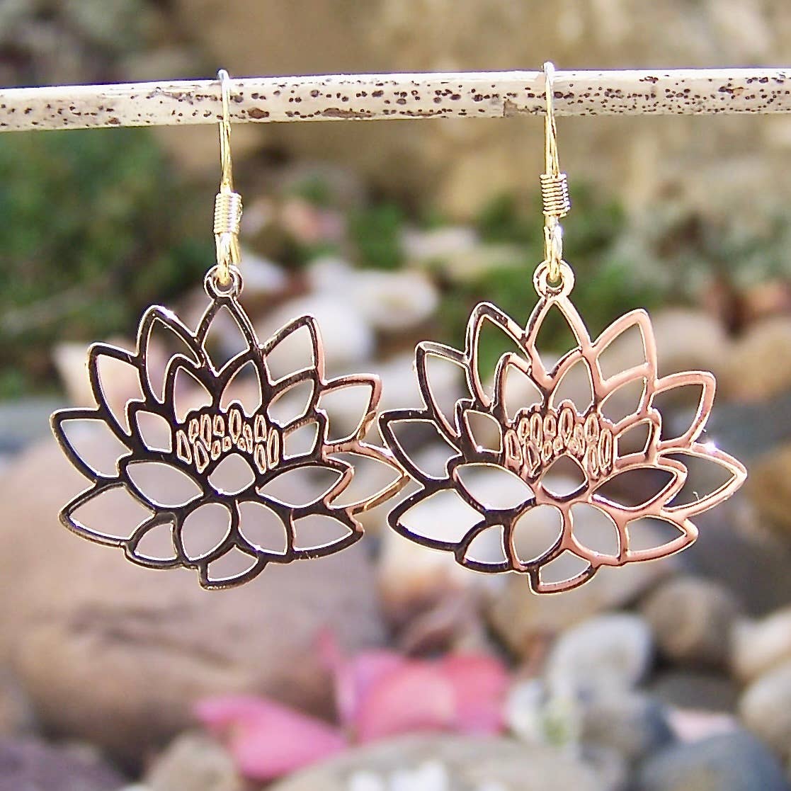 These earrings have an elegantly long and flattering shape. The leaf-like branching patterns give the drops texture and character, and the charms are especially well made. 45mm gold and silver platinum plated charms on surgical steel ear wires.