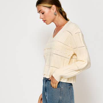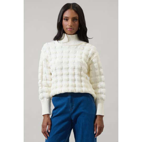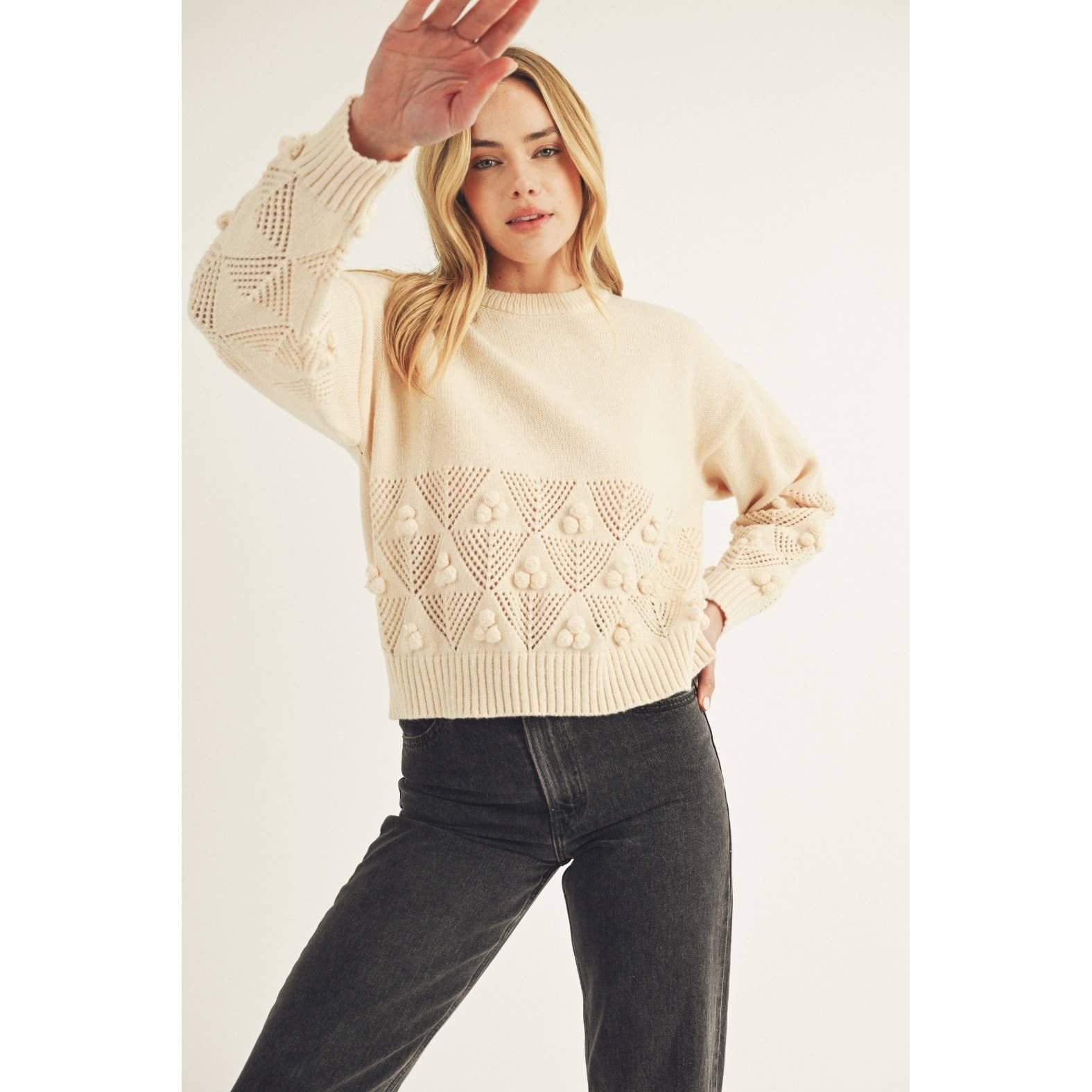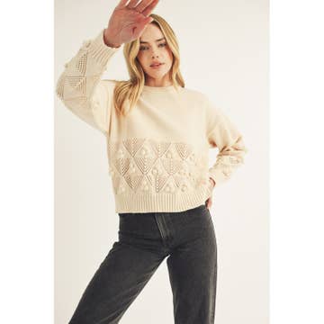 This cozy cream sweater is crafted with chunky knit texture, featuring intricate cable knit patterns and playful pom-pom detailing throughout. Its relaxed fit and ribbed hem, cuffs, and neckline add to the snug, comfortable design. Perfect for keeping warm while still making a stylish statement, this sweater blends timeless knitwear tradition with a modern, textured look.
