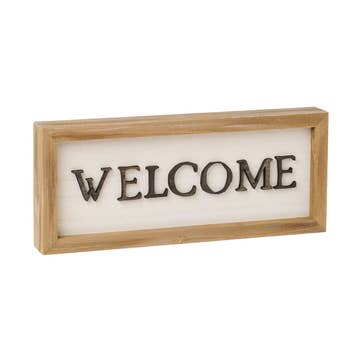 These wooden WELCOME signs feature my original photo letter art in the neutral color scheme. Features My original letter photography Handmade of Pine Wood by us, from start to finish My original letter collage is permanently affixed on the painted wood Two protective finish coats over the top No glass used for a durable, unique, shatter-proof piece Small : 6.25 x 1.5 inches - can stand alone Medium : 8.5 x 2 inches - can stand alone + has a metal hanger on the back Shop Display : When these are displayed in a brick and mortar shop, they are generally on a shelf, free-standing, rather than hanging. 9 inches will be enough width to display these signs There is my logo label sticker on the back. * Any other items shown in the photo besides the sign are props to show sizing, and are not included with the item. Thank you :)
