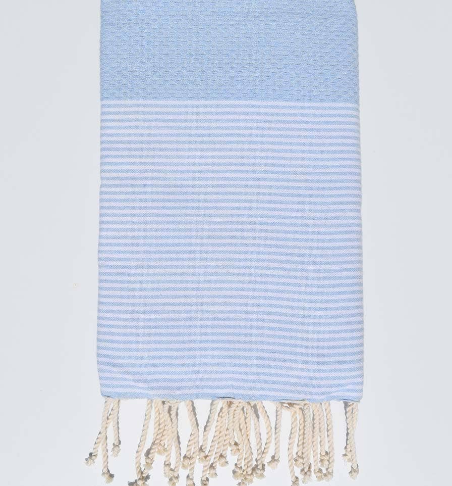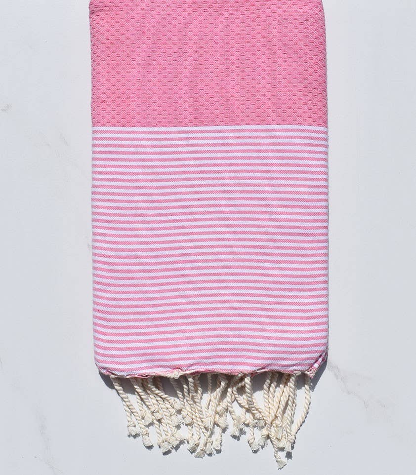 The honeycomb fouta, delicately woven from recycled cotton, combines the lightness of weaving with ecological sustainability. By opting for this fouta, you are choosing an environmentally friendly product, thus contributing to the reduction of textile waste. Versatile and absorbent, it is perfect for various uses. Whether for a day at the beach, a trip to the pool, a picnic, or even as a home decor item, this fouta brings a touch of casual and conscious style. Opt for an ethical and elegant style by choosing our recycled cotton fouta. Combine your comfort with a responsible approach for a chic and environmentally friendly lifestyle. Origin: TUNISIA Material: Recycled cotton Weaving: Honeycomb Washing: Machine 30° Dimensions: 1 m x 2 m Weight: 400g