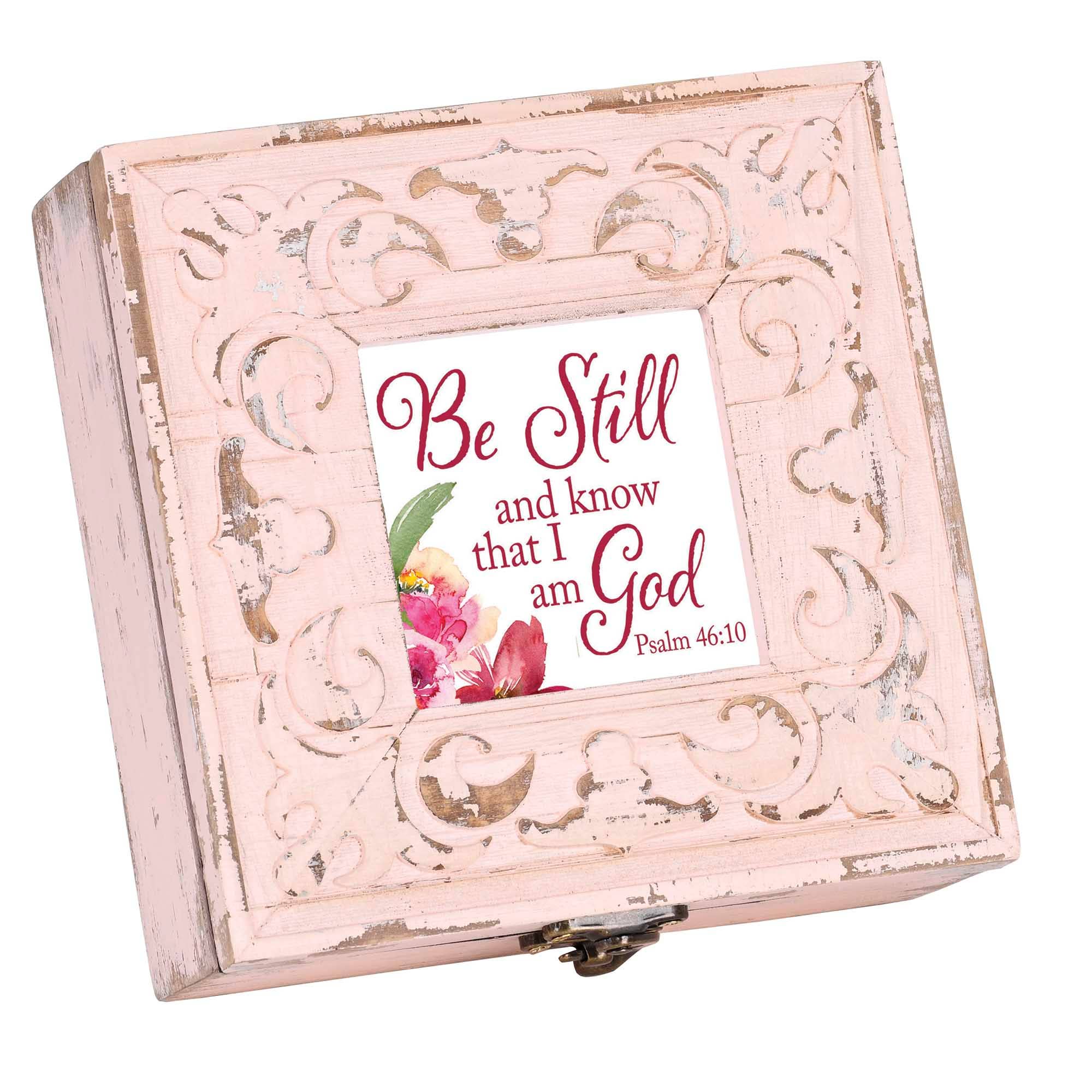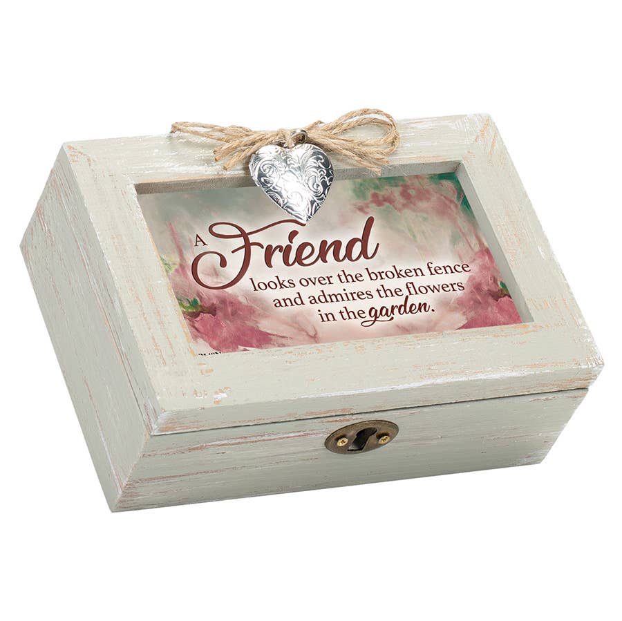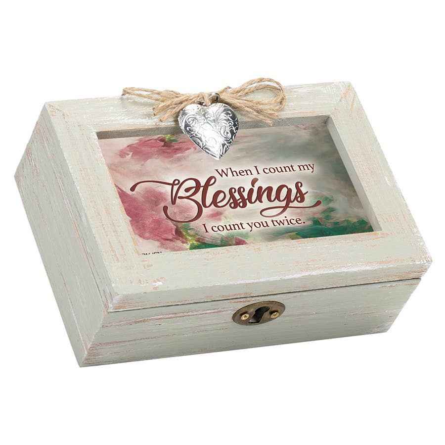 Musical Keepsake Box Features A Carved Look With A White Distressed Finish. The Hinged Lid Is Also A Photo Frame; Features A Lovely Art Print, Under Glass. Print Can Be Changed Out For A Favorite 6 x 4 Photo; Frame Has Removable Back Under Lid. Inside Box Is A Small Compartment With Clear Glass Top That Shows The High Quality Sankyo Musical Movement. When Key Under Box Is Wound, Music Will Play When Lid Is Open And Stop When It Is Closed. Box Is Made Of MDF. Overall Size Is 8-1/2 x 6-1/2 x 2-1/4. Plays The Song: Amazing Grace.