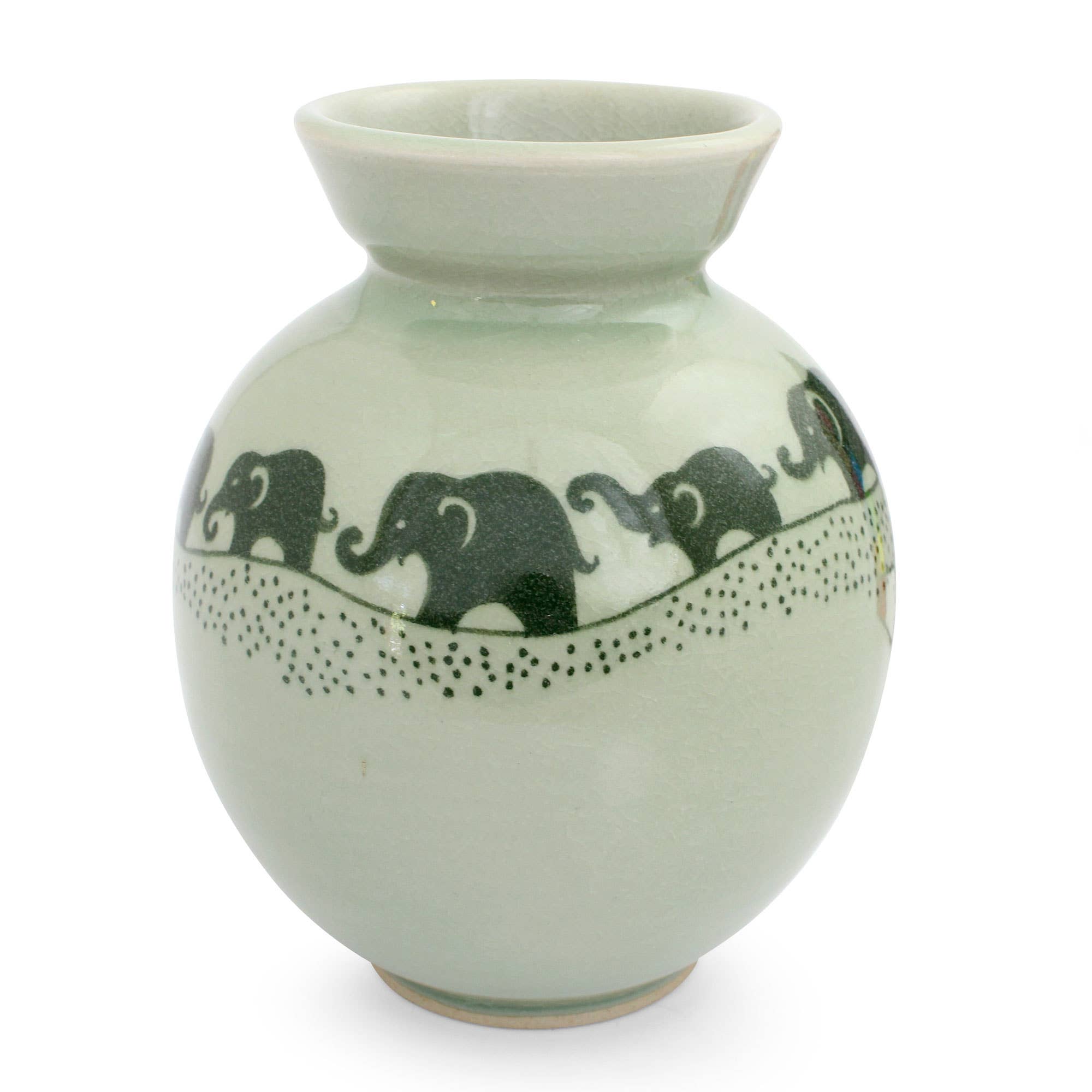 Porcelain vase with handles. Tan with elephant design painted in dark blue.