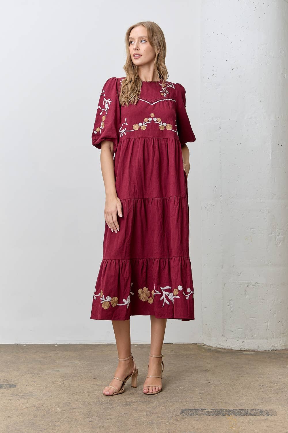 (PLUS SIZE) EMBROIDERED SQUARE NECK BUBBLE SLEEVE MAXI DRESS