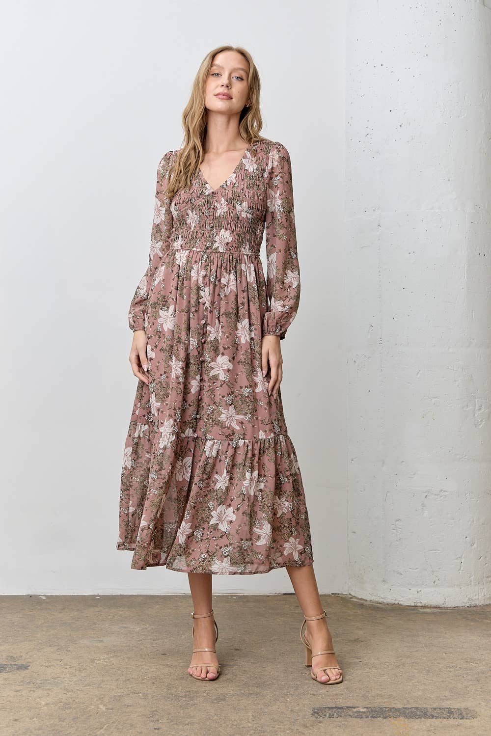 EMBROIDERED FLORAL SOLID LONG SLEEVE DRESS
