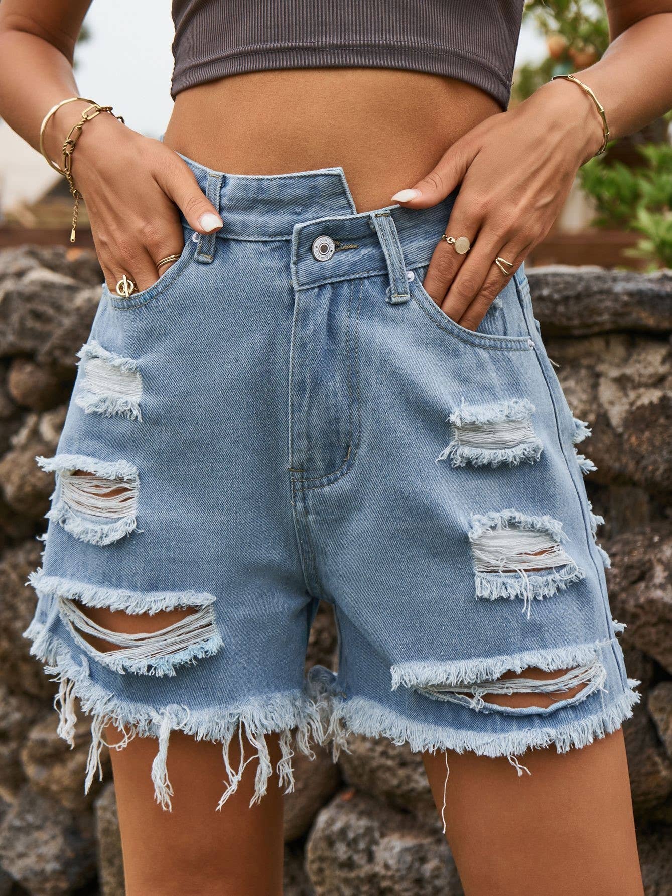 The Women's Distressed Denim Shorts with Frayed Hem and Classic Five-Pocket Design are a must-have for your summer wardrobe. Crafted from high-quality denim, these shorts feature stylish distressing and a trendy frayed hem, giving them a chic, casual look. The classic five-pocket design offers functionality and style, while the comfortable fit ensures all-day wearability. Material: 73% Cotton 14% Viscose 11% Polyester 2% Spandex MEASUREMENTS: Product Length "12-12.5"in 4-6-Small | Waist: 25"-26.5"in | Hips: 35"-36.5"in 8-10-Medium | Waist: 26.5"-28"in | Hips: 36.5"-38"in 12-14-Large | Waist: 28"-29.5"in | Hips: 38"-39.5"in 16-18-XL | Waist: 29.5"-31"in | Hips: 39.5"-41"in 20-22-XXL | Waist: 31"-32.5"in | Hips: 41"-42.5"in Measurements: Product Length "30-32"cm 4-6-Small | Waist: 63-66cm | Hips: 88-91cm 8-10-Medium | Waist: 67-71cm | Hips: 92-96cm 12-14-Large | Waist: 71-75cm | Hips: 96-100cm 16-18-XL | Waist: 75-79cm | Hips: 100-104cm 20-22-XXL | Waist: 79-83cm | Hips: 104-108cm