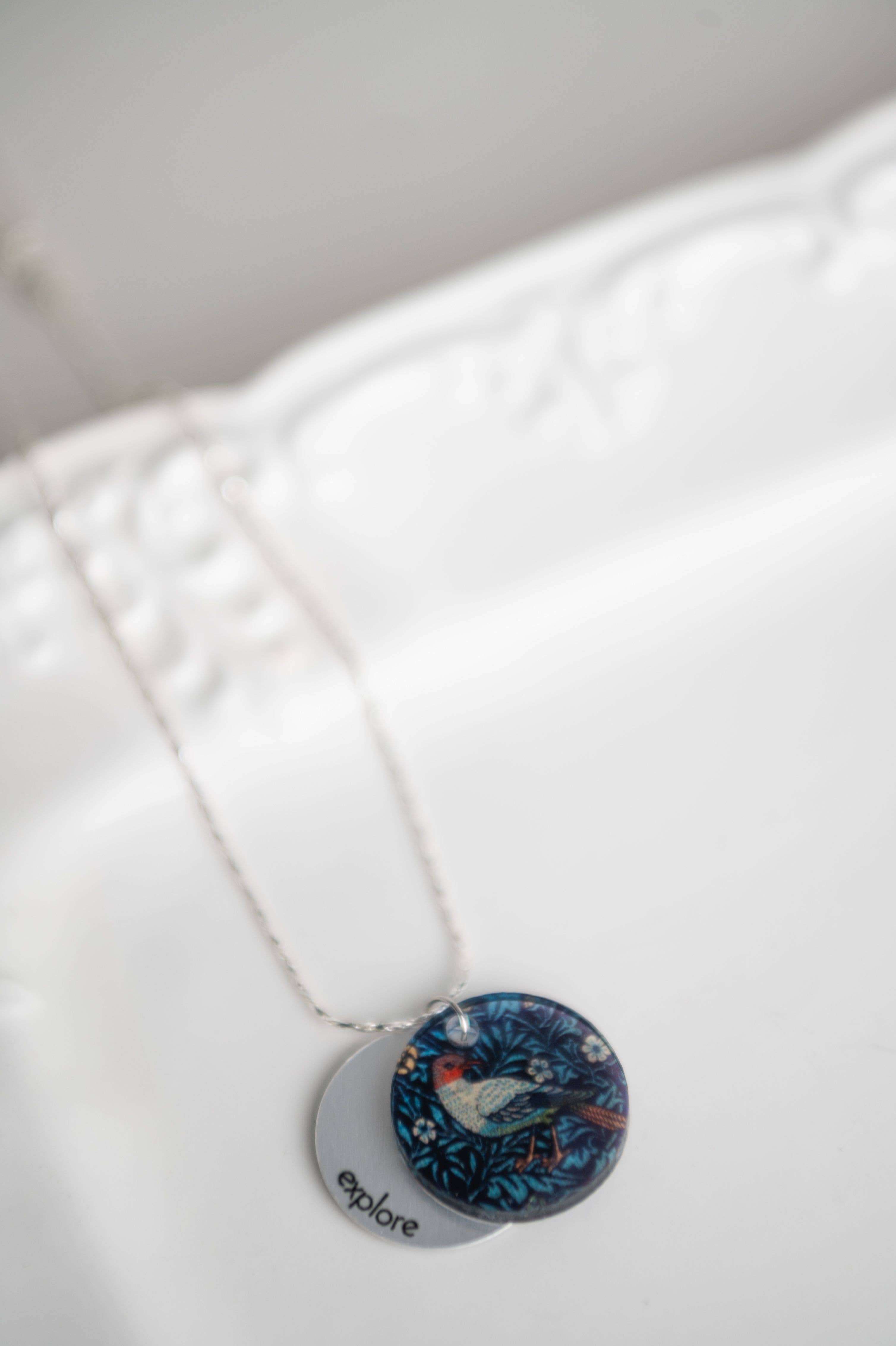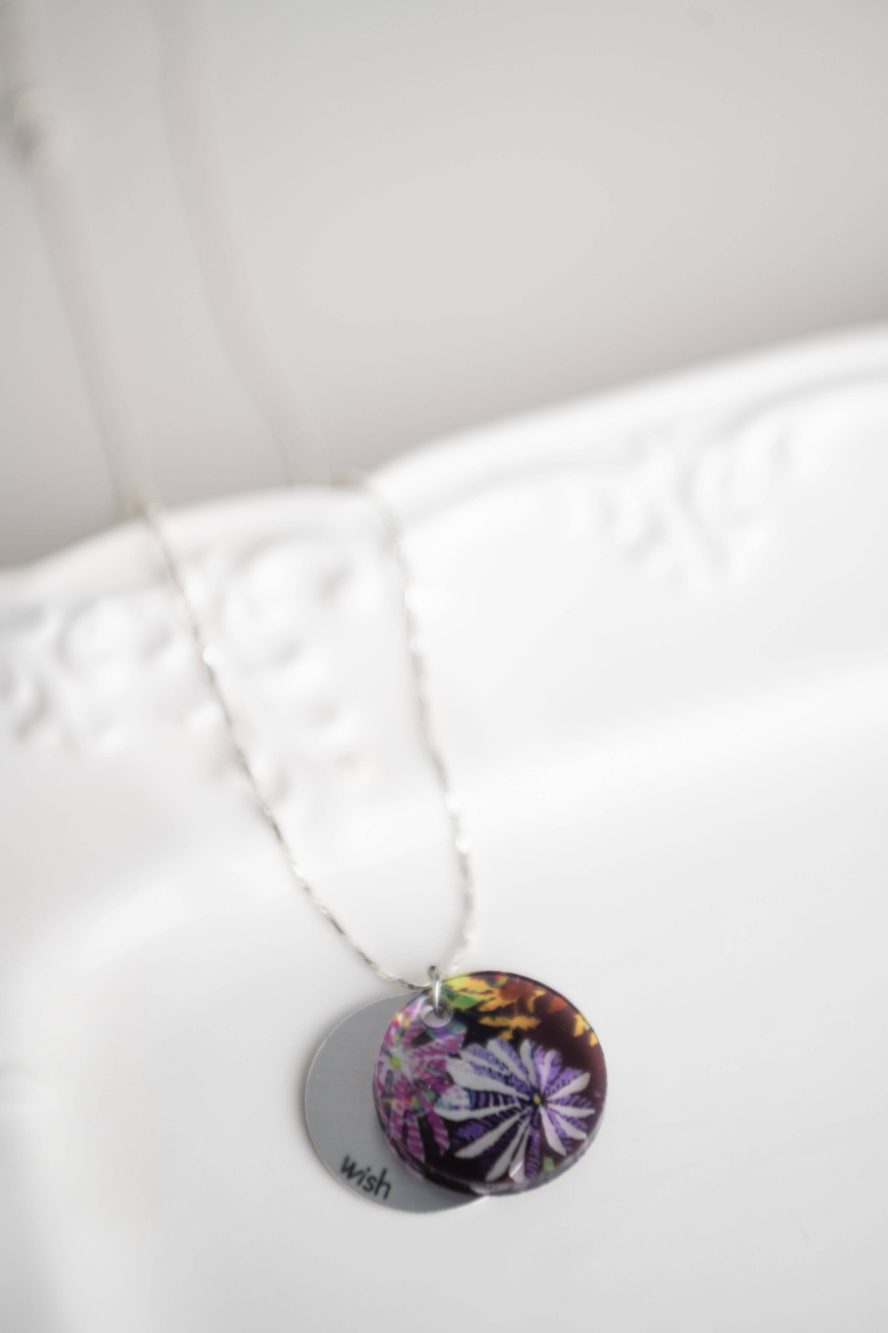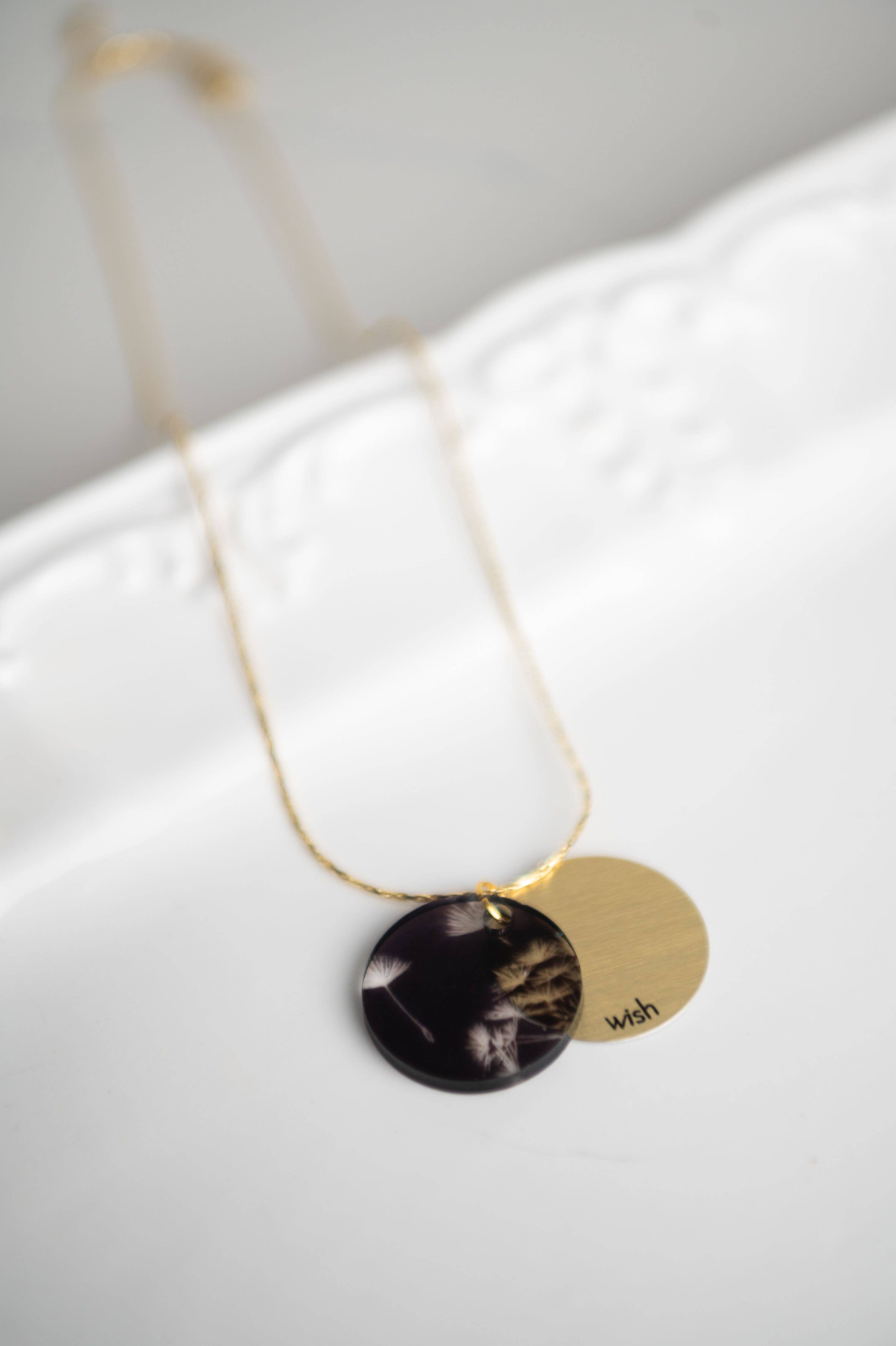 Illuminate your inner beauty with our eclipse inspirational charm necklace! Choice between Gold or Silver. Mix of inspirational words: bloom, strong, create, explore, fearless, journey, inspire, courage, breathe, dream, authentic, peace. Retail Ready: Each piece features a layered 1" acrylic charm infused with a pattern and backed by a recycled metal word charm, suspended on an 18" adjustable chain. Hypo-allergenic, lead, and nickel-free. Eco-Friendly: Crafted from upcycled acrylic and aluminum. Handmade Local: Each piece is handmade in Niagara Falls, ON. Give Back: Every purchase supports charities.