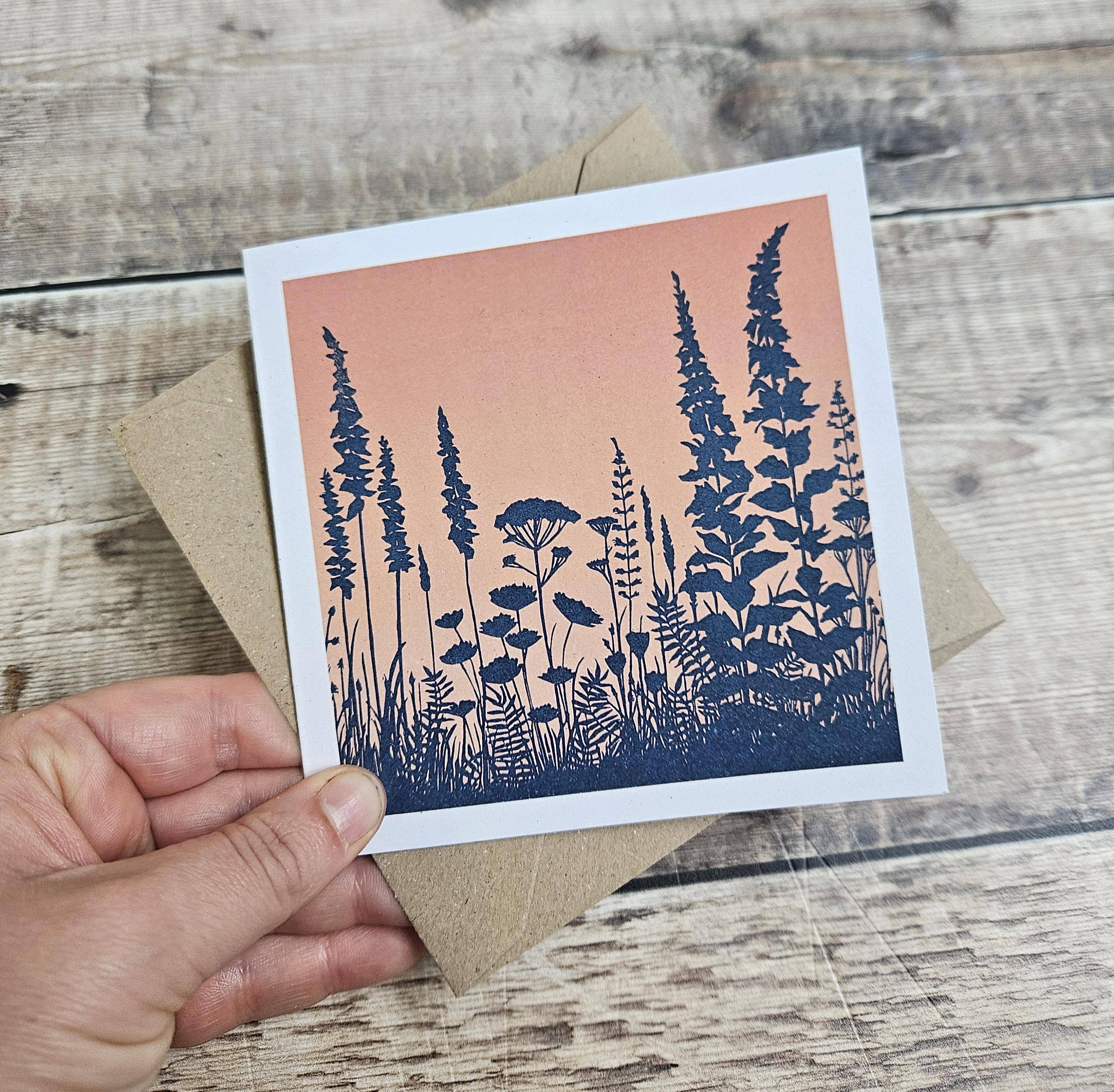 Sunflower Field - Single Square Greetings Card With Recycled Brown Envelope (Blank Inside) Single greetings card digitally reproduced from my original 'Sunflower Field' linocut. Blank inside for your own personal message. Digitally printed greetings card Dimensions: 12cm x 12cm Digitally printed on smooth 350gsm recycled card My greeting cards are created using a recycled 350gsm, uncoated, silky smooth stock made using 100% recycled post consumer waste which can lead to varied speckling in the finished sheet adding character to your cards. They are also FSC Certified.