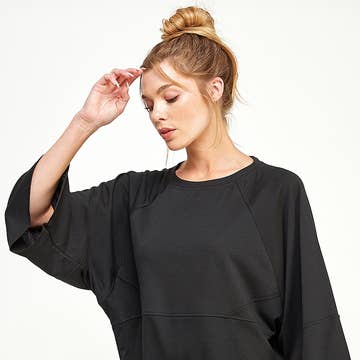 Made in United States Aesthetic: Classic and Retro / vintage Care Instructions: Dry clean only Color: Black Fabric: poly blend deadstock Fit: Contemporary Neckline: Crew neck Occasion Theme: Everyday Occasion: Everyday and Work Pattern: Solid Season: Core Sleeve Length: Long Sleeve Product Language: English Product Materials: Recycled and Upcycled Production: Ethically sourced