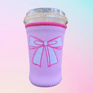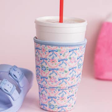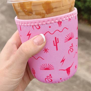 • white flower pattern on a bright pink background w/ pink sleeve rim • hand-drawn original design • neoprene material keeps your drinks cool and your hands dry • the small size will fit best on 12/16oz drink cups (Starbucks tall/grande or Dunkin' small) and is 4" tall • the medium size will fit best on 24oz drink cups (Starbucks venti or Dunkin' medium) and is 5" tall • the listing image shows a medium sleeve on a Dunkin' medium drink