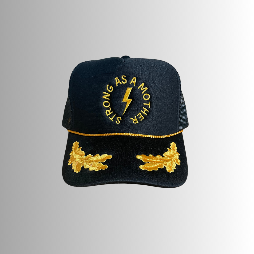 The Captain Hat has "mother." embroidered in Gold on our premium trucker hat in Black. Feel empowered and strong while wearing this hat. Features: * High profile, structured * Color: Black and Gold * "Mother." embroidered on front * Slightly curved visor * Foam trucker with nylon mesh back * Plastic snapback We donate 10% of our proceeds to charitable organizations supporting mothers in need.