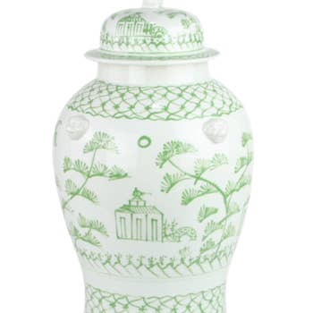 Our best-selling ginger jars just got a Chinoiserie makeover! These decor staples are hand-painted by a talented Lo Home artist with our new favorite motif composed of winding Chinoiserie -inspired botanicals. Each piece is a unique work of art which will add an elegant touch of color and pattern to any area of your home or event! Our classic swallow-tail lidded jars are hand-poured in Oklahoma/ Pennsylvania and hand-painted by a Lo Home artist before being fired for a beautiful and durable finish which is food and water safe. Dimensions: Small: 5" W x 5" D x 8" H Medium: 6.75" W x 6.75" D x 13.5" H Large: 8.5" W x 8.5" D x 16.5" H